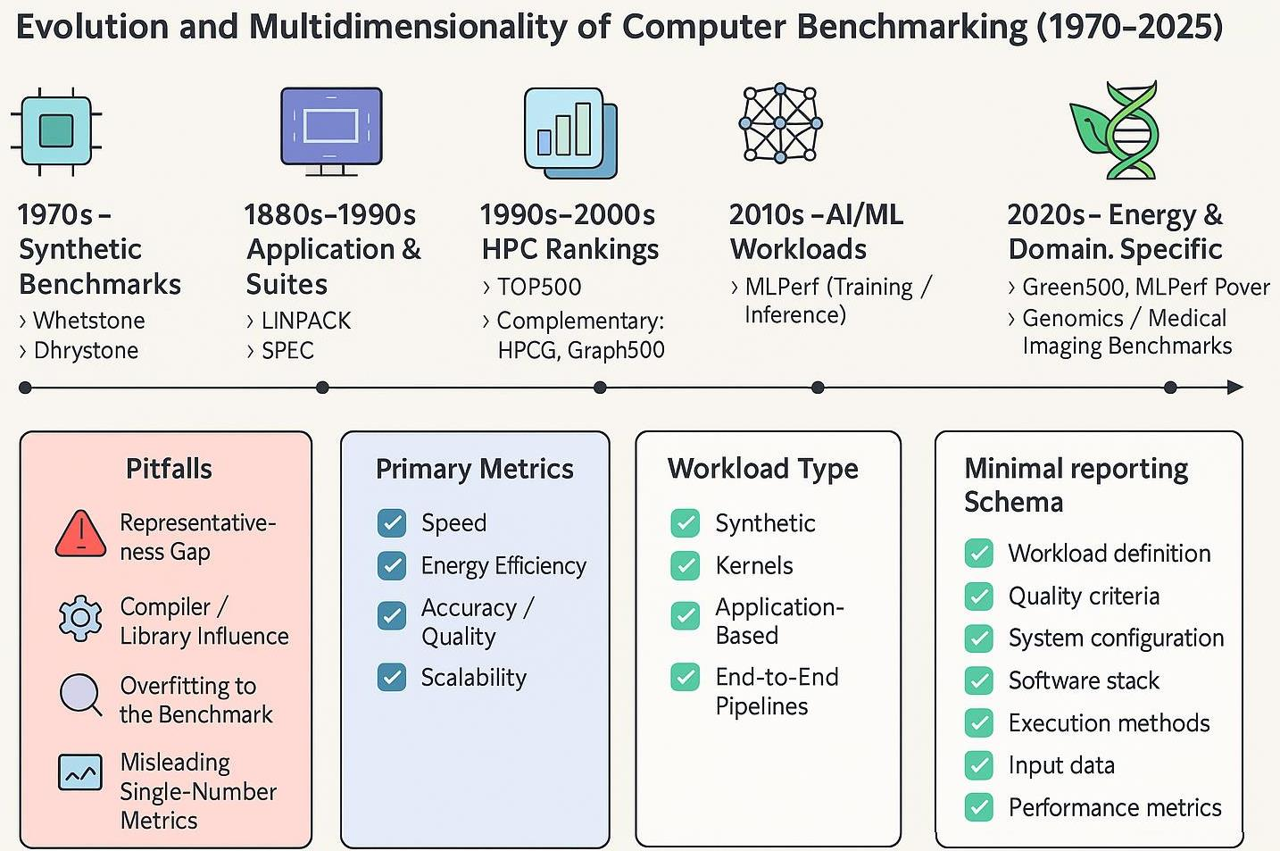 - Domain Focus: General-purpose computing (SPEC CPU), HPC (TOP500/HPCG/Graph500), AI/ML (MLPerf, TPCx-AI), and biomedical sciences (genomics, imaging).
