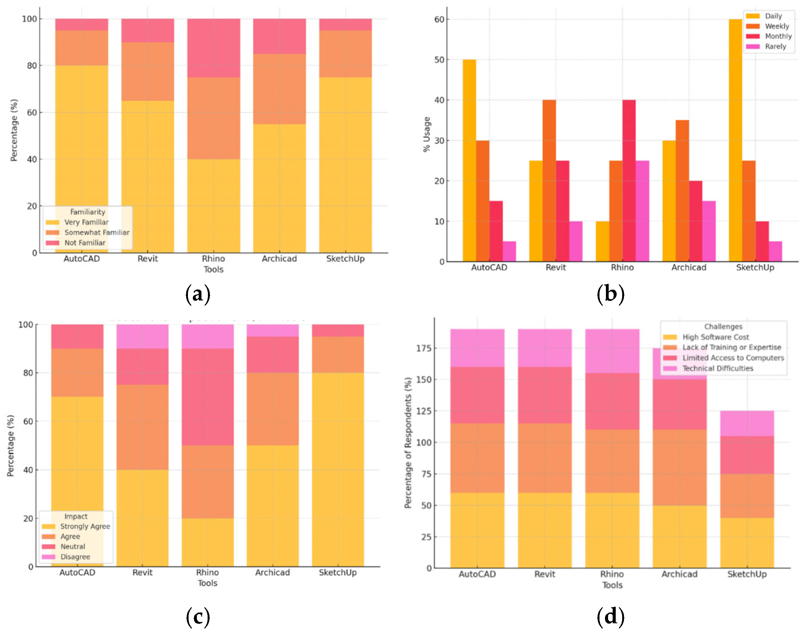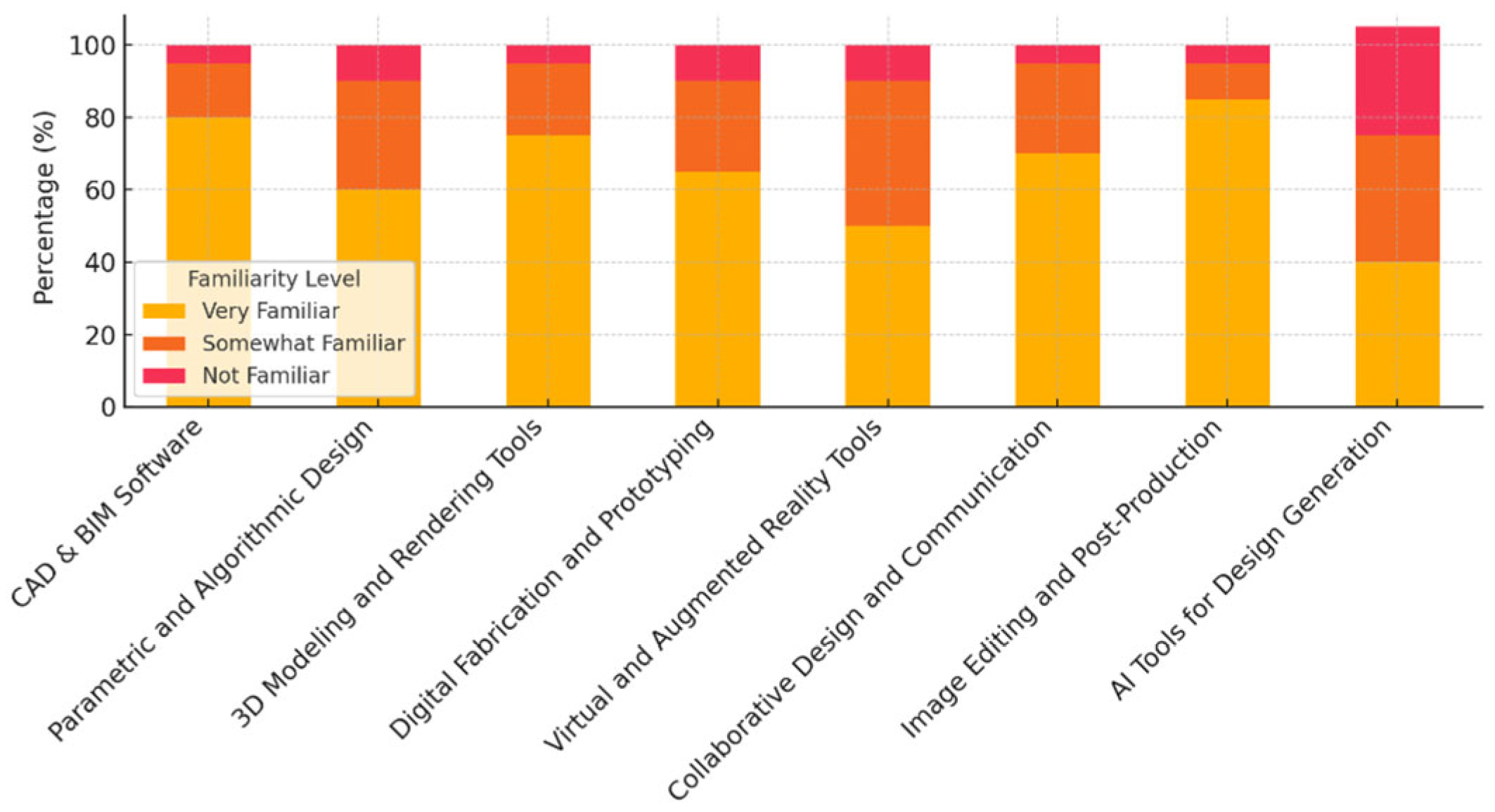 Results from this analysis show that AutoCAD and SketchUp have the highest familiarity, with 80% and 75% of respondents being very familiar with them, respectively. This indicates that these tools are well-established and commonly used in design education. While Revit and Archicad have lower familiarity levels (65% and 55%), suggesting that these tools are important but less universally recognized or adopted compared to AutoCAD. And finally, Rhino shows the lowest level of familiarity, with only 40% of respondents reporting high familiarity, possibly reflecting its more specialized use.