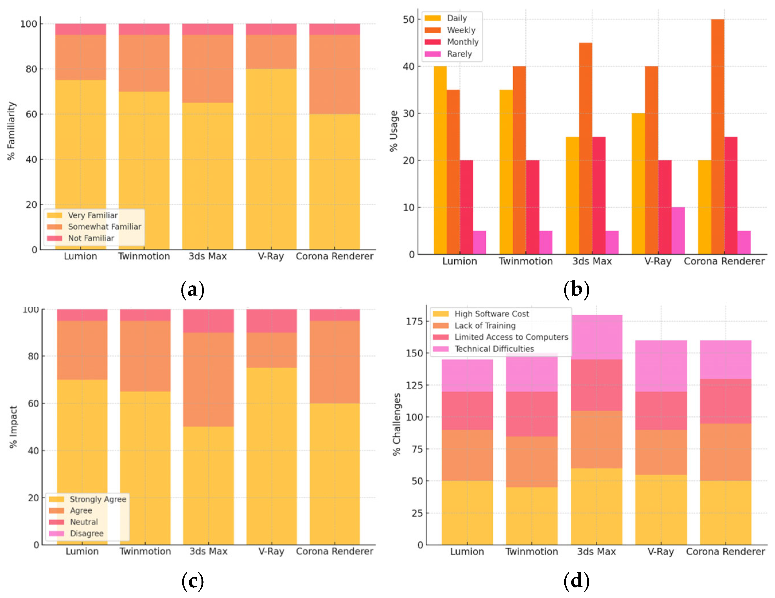 The same analytical framework reveals that V-Ray has an outstanding educational presence, with 75 percent of the respondents providing a high recommendation of effectiveness in the promotion of teaching and learning. The high fidelity and versatility of the tool make it a great asset in the design pedagogy. Lumion and Twinmotion also exhibit a high positive impact, with 70 percent and 65 percent of teachers confirming that they contribute to student learning, respectively. Their ability to provide real-time visualizations is particularly useful in enabling them to perform quick design iterations. Three-de-e-eight-seo is moderately positive; 50 percent of the respondents claim to agree with it strongly, but its complexity might require further training and practice, yet it provides advanced functionality to build complex 3D constructions. Corona Renderer has slightly less impact when compared to V-Ray, but is still positive, where 60 percent strongly agreed that it maximizes educational output. The high-quality design communication is supported by the photorealism of the tool.