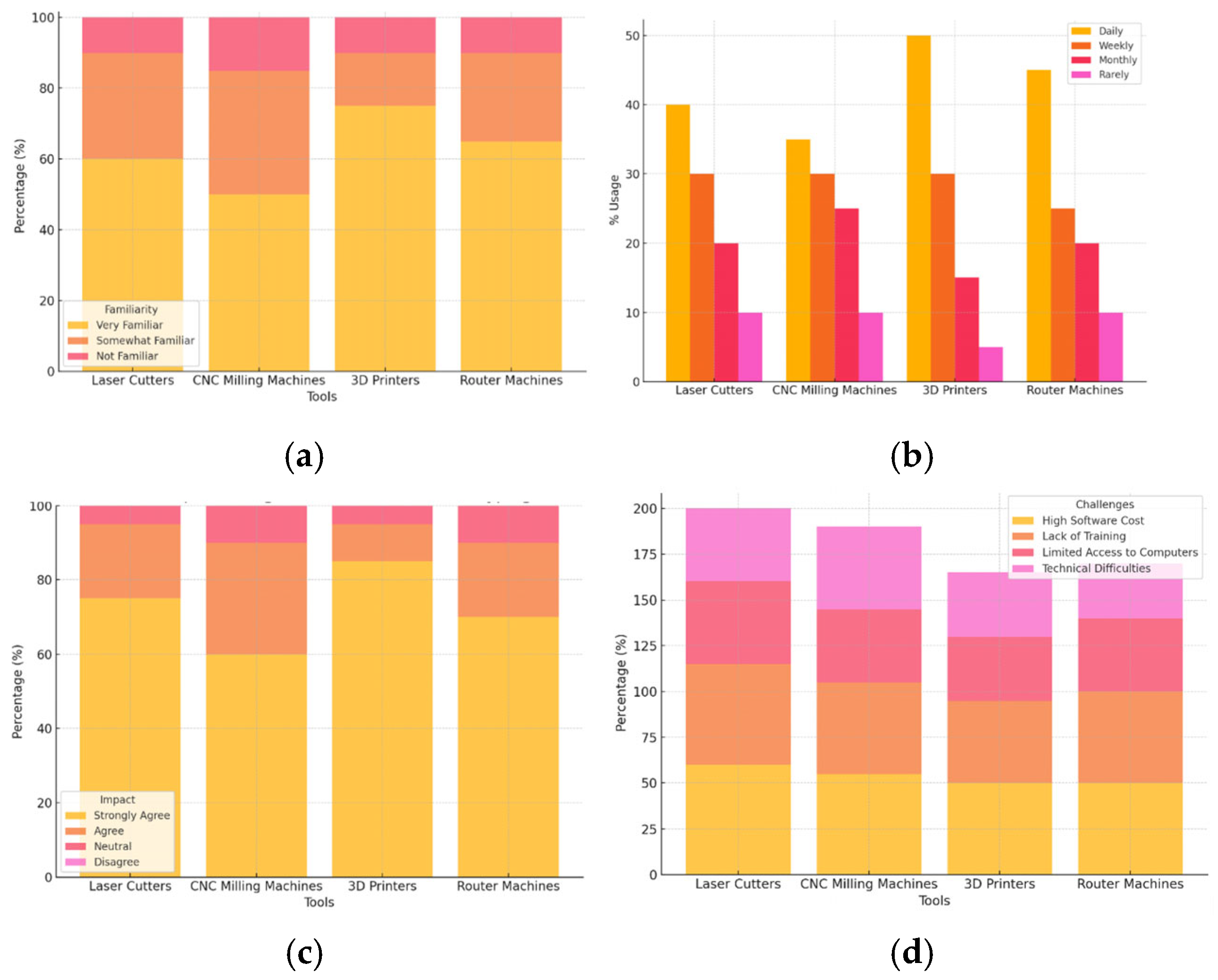 The last evaluation of educational impact signifies that the role of 3D printers has the strongest impact, with 85% of the respondents strongly supporting this as a tool to enhance teaching and learning. This was influenced by their versatility and continued spread to design education. Laser cutters and router machines also exhibit a positive effect, with 75% and 70% of respondents saying that the tools have improved learning outcomes, respectively. These tools are essential for accuracy work and may significantly enliven practical designing experiences. The influence of CNC milling machines is somewhat more uneven, with 60% of the respondents strongly agreeing that the machines might help in enhancing education, reflecting a more specialized use in the wider education spectrum.