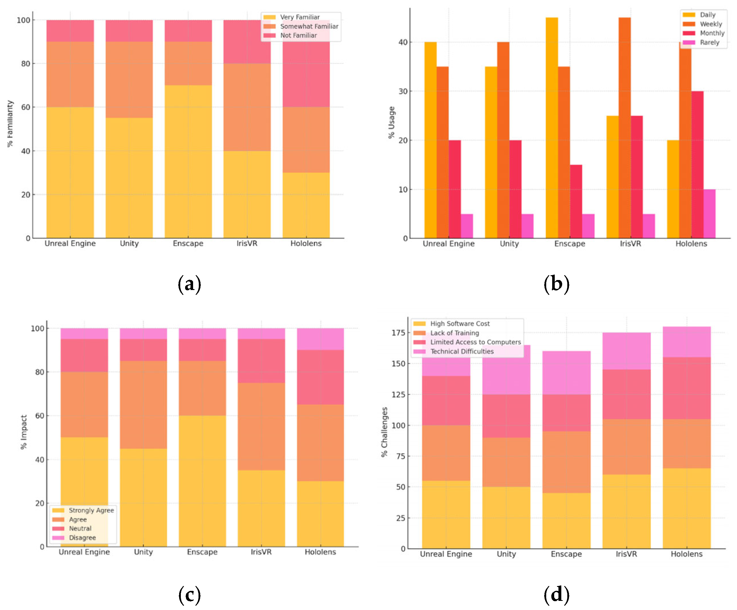 Results from this analysis show that Enscape has the highest positive impact, with 60% of educators strongly agreeing that it enhances teaching and learning. Its real-time rendering capabilities make it a powerful tool for design education. Unreal Engine and Unity also show strong educational impact, with 50% and 45% of educators strongly agreeing. These tools support immersive and interactive learning experiences. IrisVR and Hololens show a more mixed impact, with 35% and 30% strongly agreeing. While these tools are impactful for certain educational contexts, their specialized nature might limit their widespread application.