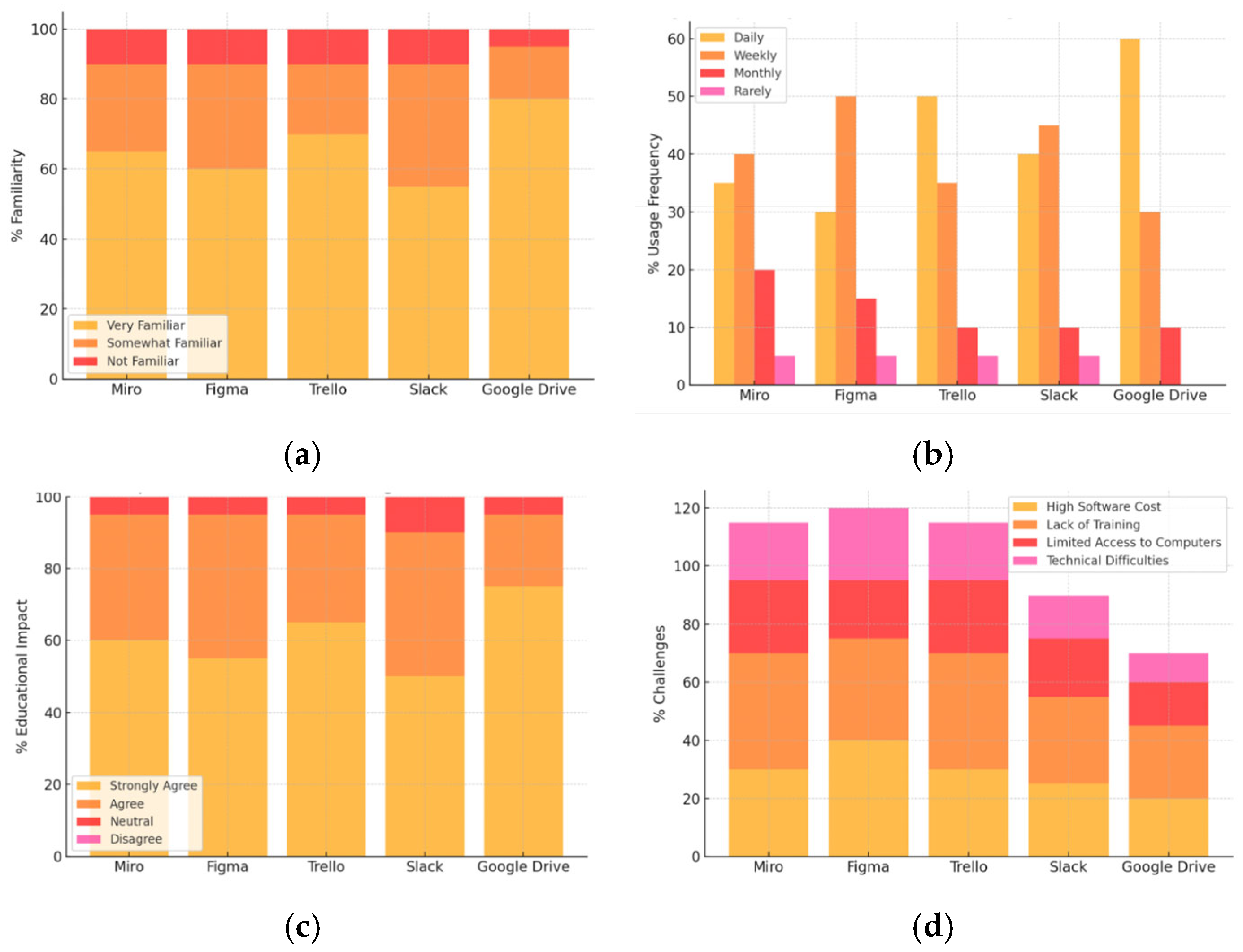 The usage frequency data indicate that Google Drive is used most frequently (60% daily), followed by Trello (50%). However, tools like Miro and Figma are used less frequently.