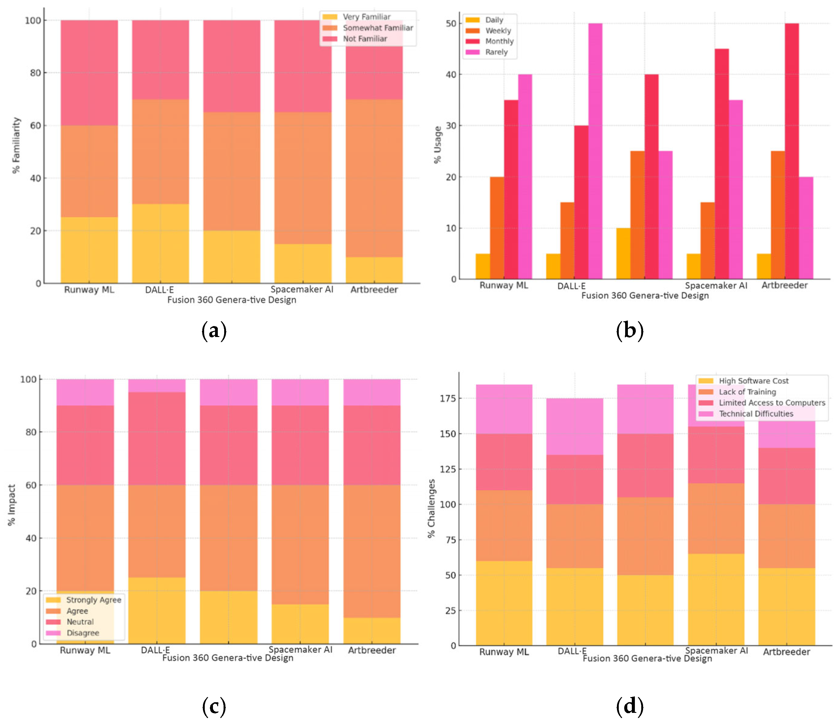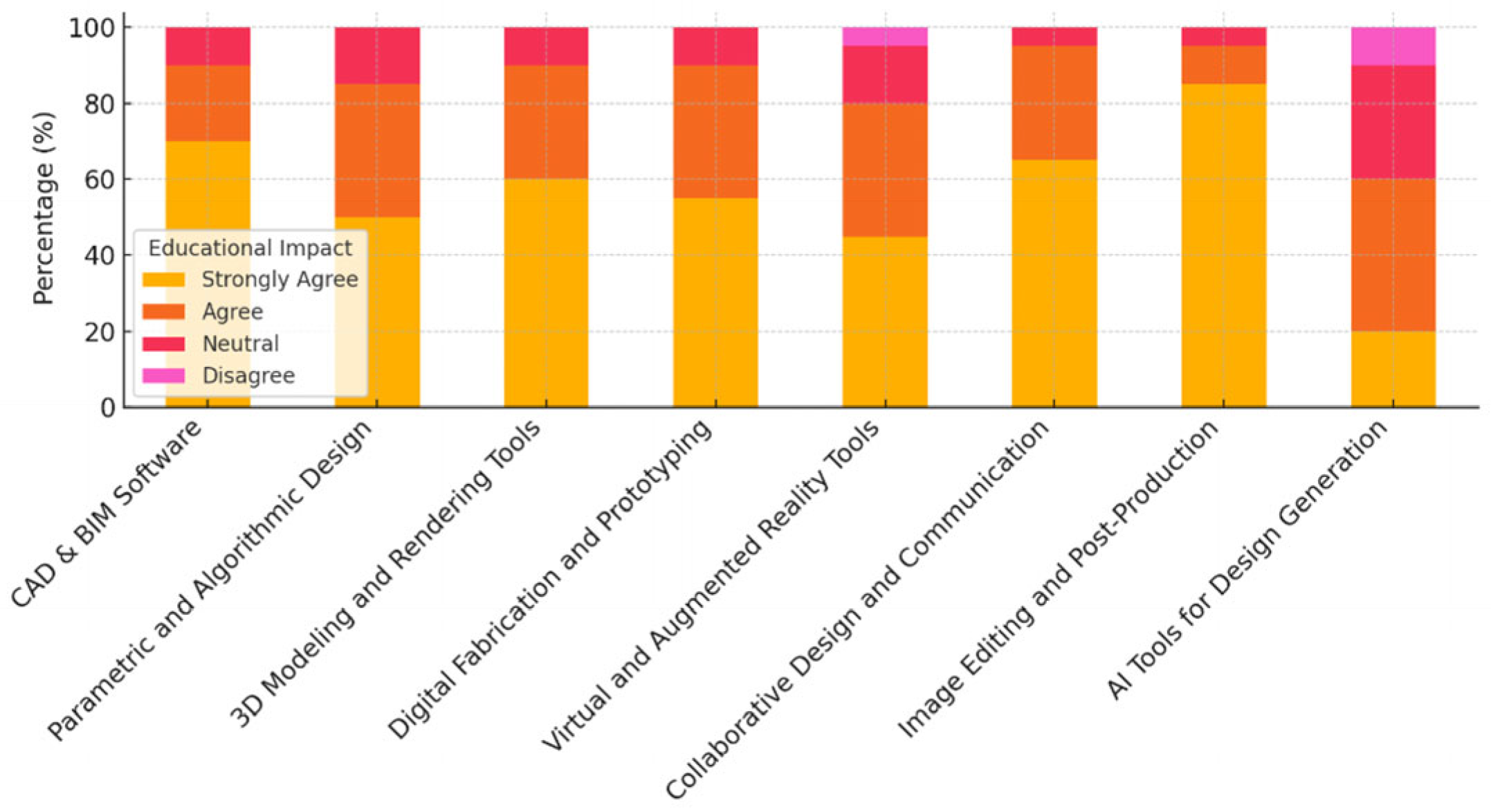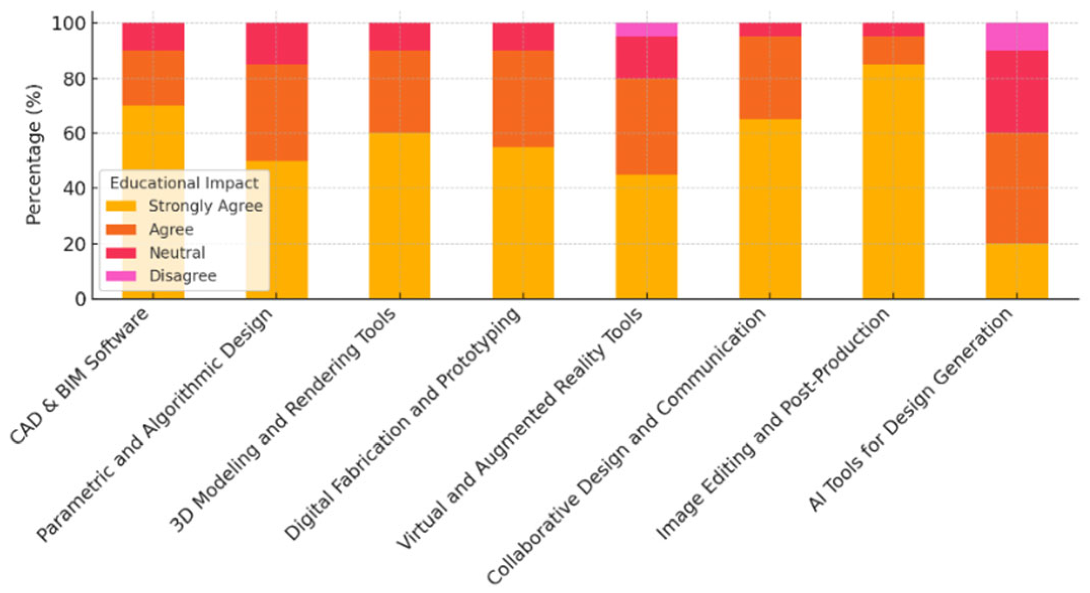 Results from this analysis show that DALL·E has the strongest perceived educational impact, with 25% of educators strongly agreeing that it enhances teaching and learning, particularly in creative and conceptual design contexts. Runway ML also shows a positive impact, with 20% of respondents strongly agreeing that it improves education. As an AI platform for creative applications, it has a unique role in generating design ideas. Fusion 360 Generative Design and Spacemaker AI show a moderate impact, with 20% of educators strongly agreeing on their educational value. These tools are highly specialized and used for specific applications in generative and architectural design. Artbreeder has the lowest educational impact but still shows some potential, with 10% of educators strongly agreeing about its usefulness in design education.