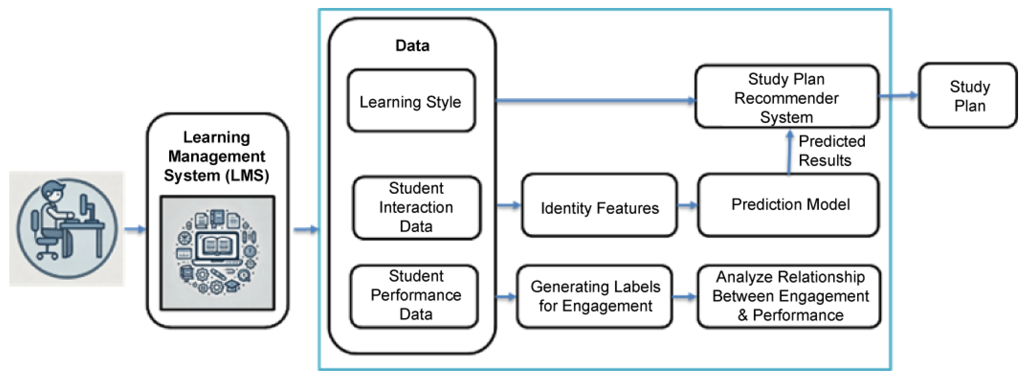 The study plan recommender system was designed to utilize multiple input sources, including student interaction data from the Learning Management System (LMS), predicted academic performance, and each student’s learning style. Interaction data were collected via the LMS, while predicted grades were passed from the previously trained performance prediction model. To determine students’ learning styles, the VARK questionnaire was administered to the same cohort of students for whom LMS interaction and performance data were available.