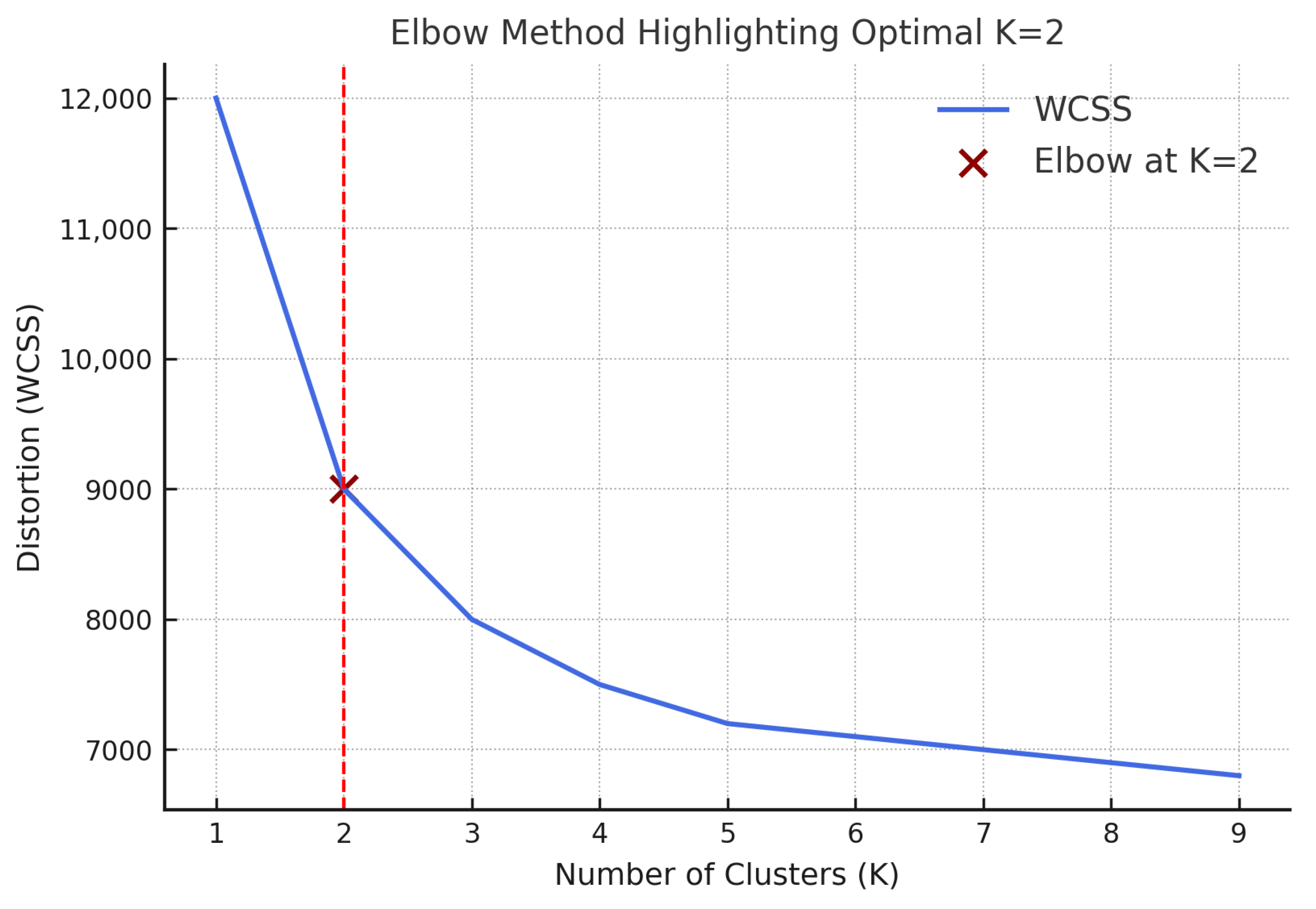 To determine the optimal number of clusters (K), the elbow method was employed by evaluating the within-cluster sum of squares (WCSS) across K values ranging from 1 to 10. A pronounced bend at K = 2 in