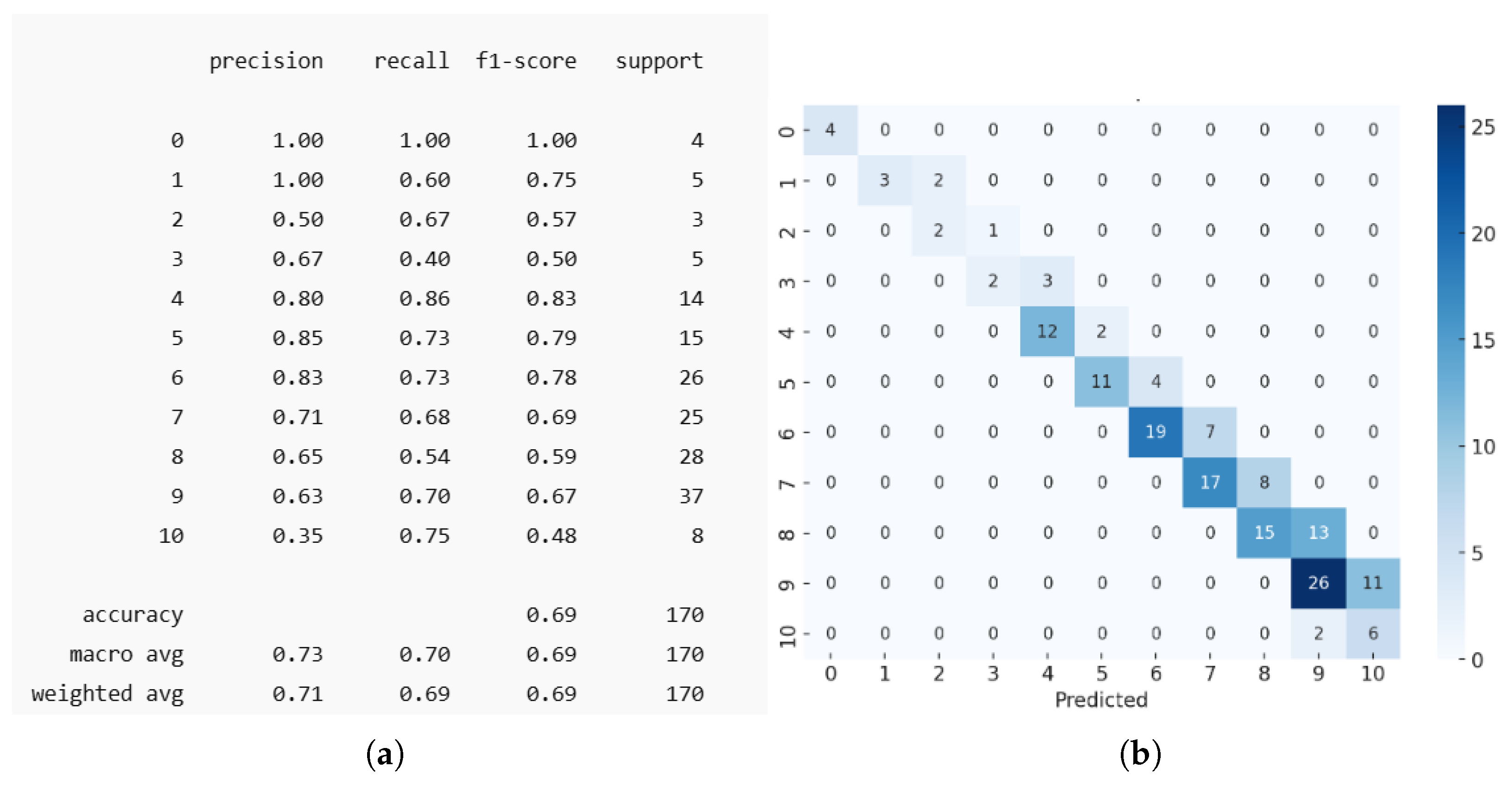 Figure 4, Classes 3 and 10 under-perform compared to others, having an F1 score below 0.5. Mid-range classes (4 to 9) perform reasonably well. Classes 0 and 1 perform considerably well, despite the limited number of cases in each class.