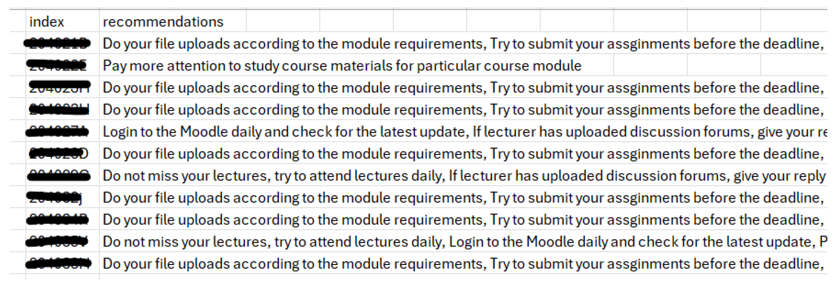 The study plan recommendations are generated using the trained KNN model. The process outlines the full pipeline—from accepting new input data to writing the final recommendations into a structured CSV file. A sample output of a CSV file, containing recommended study plans for several students, is displayed in
