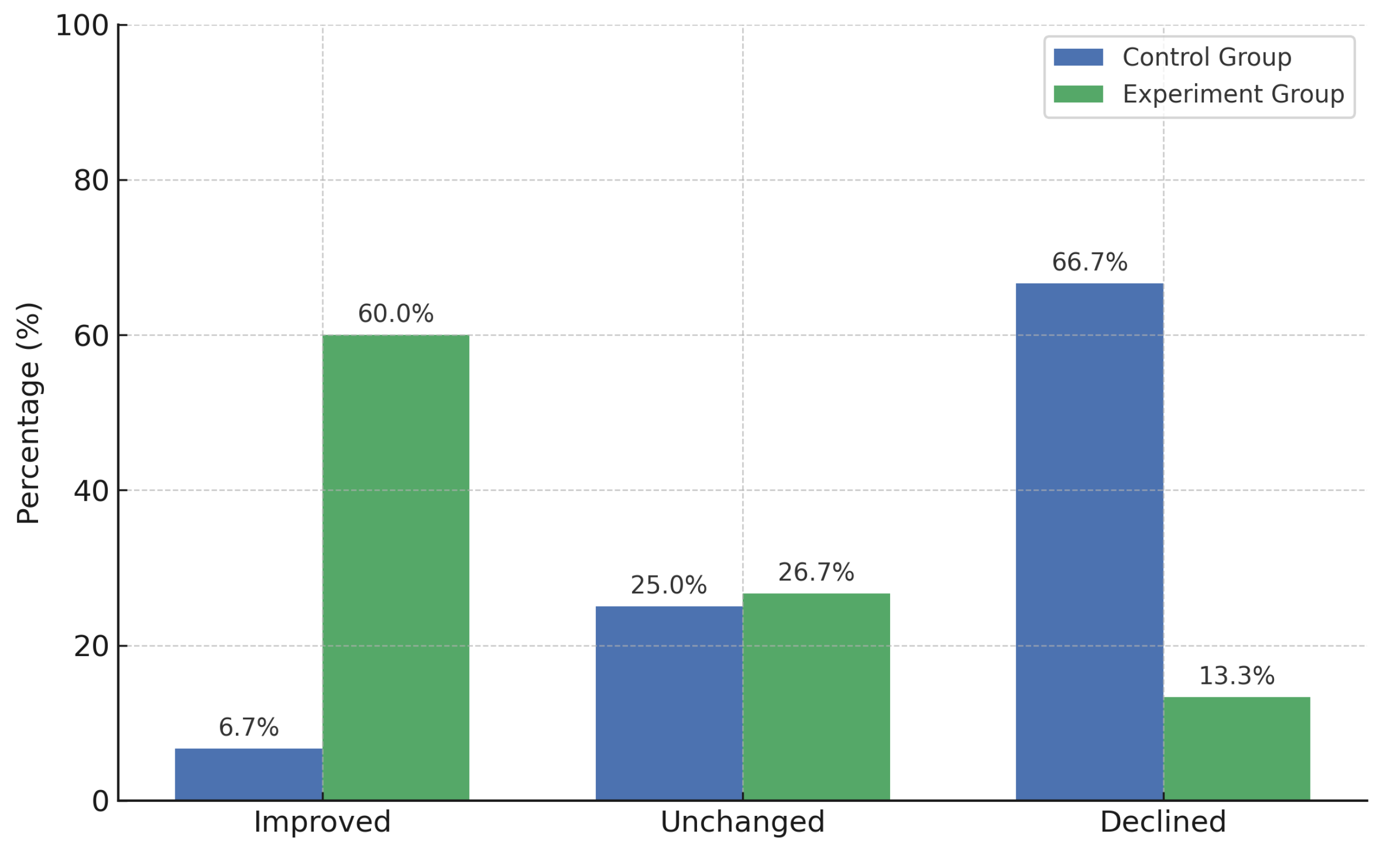 These findings contrast sharply with the control group, in which the majority of students experienced a decline in academic performance. In contrast, a significantly higher proportion of students in the experiment group demonstrated improved outcomes. This observation is further supported by the comparative analysis illustrated in