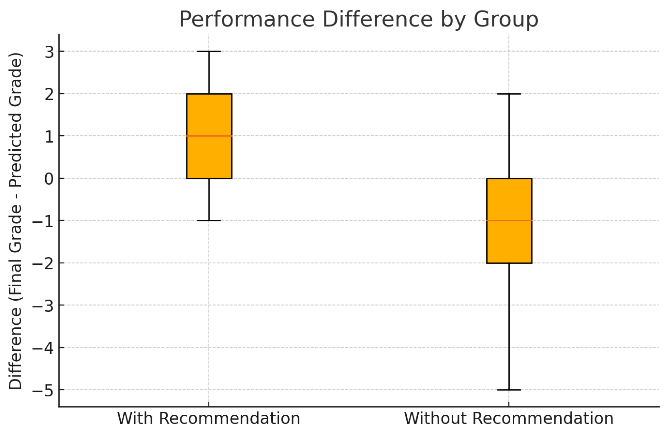 Figure 7 illustrates a box plot comparing the distribution of performance differences between the two groups. Students who received personalized recommendations exhibited more consistent achievement levels and frequently surpassed their predicted grades. In contrast, those without recommendations tended to underperform and showed greater variability in outcomes. These patterns are consistent with the statistical analyses, reinforcing the hypothesis that tailored study support contributes to improved learning performance. The observed improvements further reflect the system’s primary objective—delivering personalized academic guidance based on individual learning styles and interaction behaviors—highlighting its potential effectiveness in authentic educational settings.