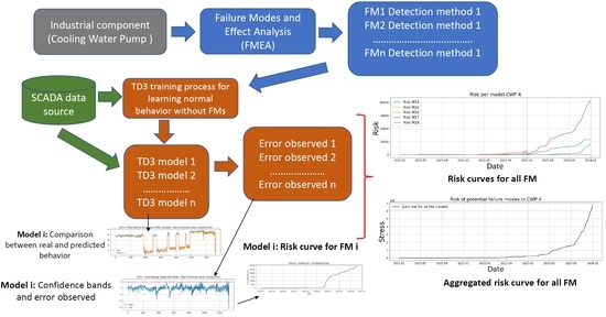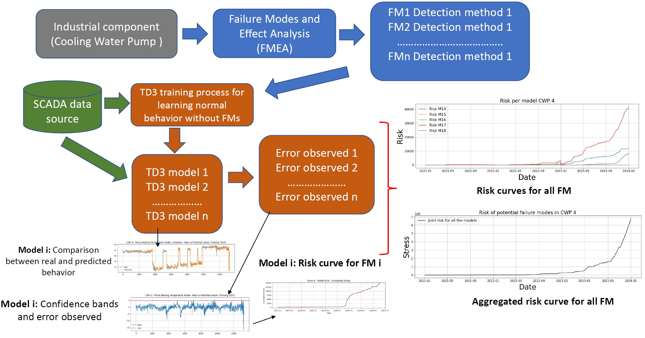 Other contributions of this paper are supported by the failure mode risk curves proposed as indicators of the health condition of industrial components. The models developed using the TD3 algorithm monitor if symptoms of deviation with respect to the normal behavior expected are observed. If they exist, the value of this deviation is used to estimate a risk indicator whose accumulated value gives a profile of failure mode progression that is extremely useful for making decisions for both maintenance and operation crews.