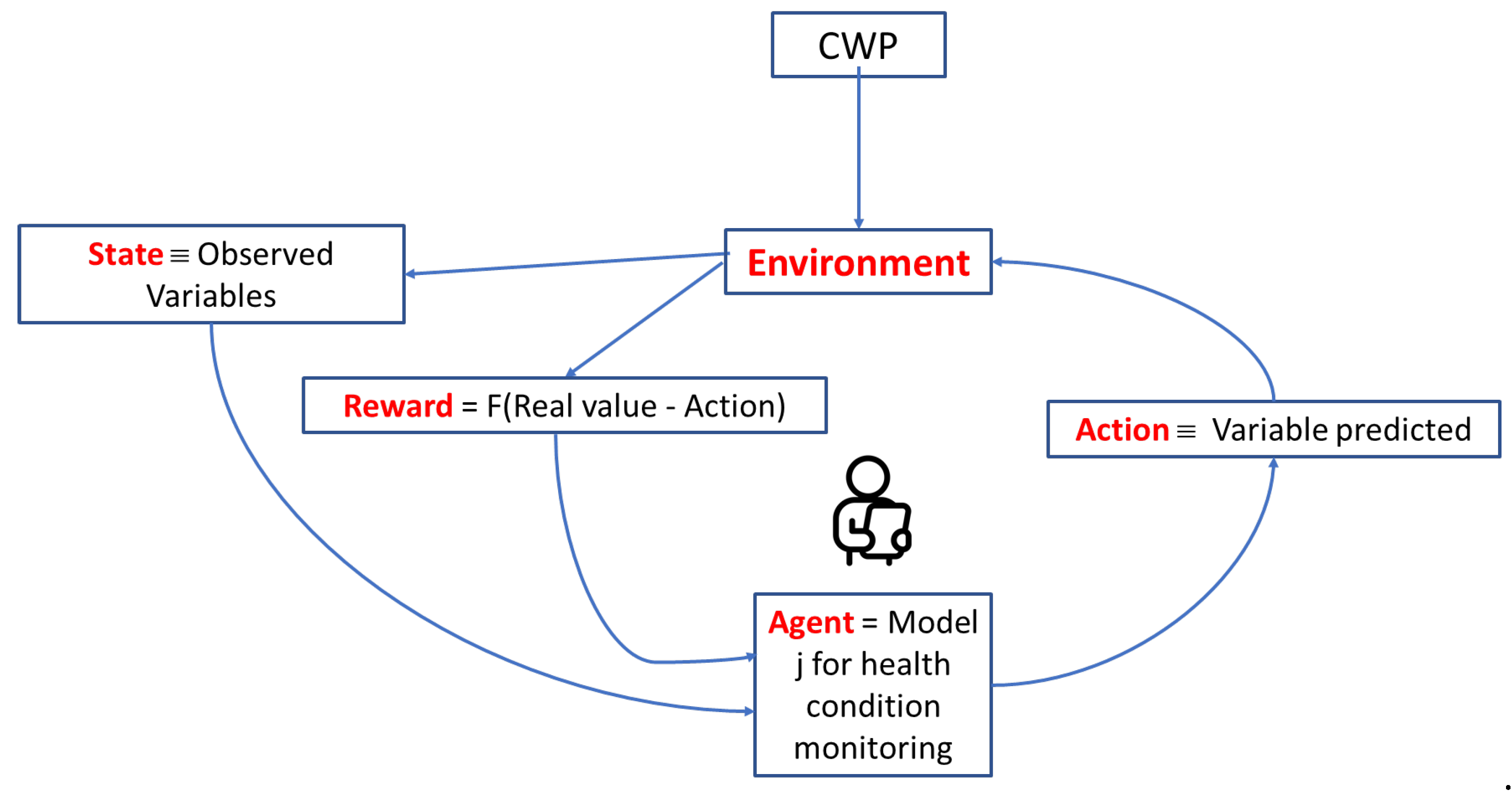As was mentioned before, the environment is one of the key components of reinforcement learning. Here, instead of using a generic or a pre-designed environment, a specific environment was created for each model responsible for monitoring if an anomaly that could cause a failure mode is present. This allows the agent to learn in an environment that reflects the working conditions of the CWP exactly. The use of the environment is quite straightforward. At each step, the agent receives as input an observation that includes the variables necessary to predict the target variable. According to the input received, the agent interacts with the environment, generating an action, which in this case is a prediction of the value of the output variable being modeled.