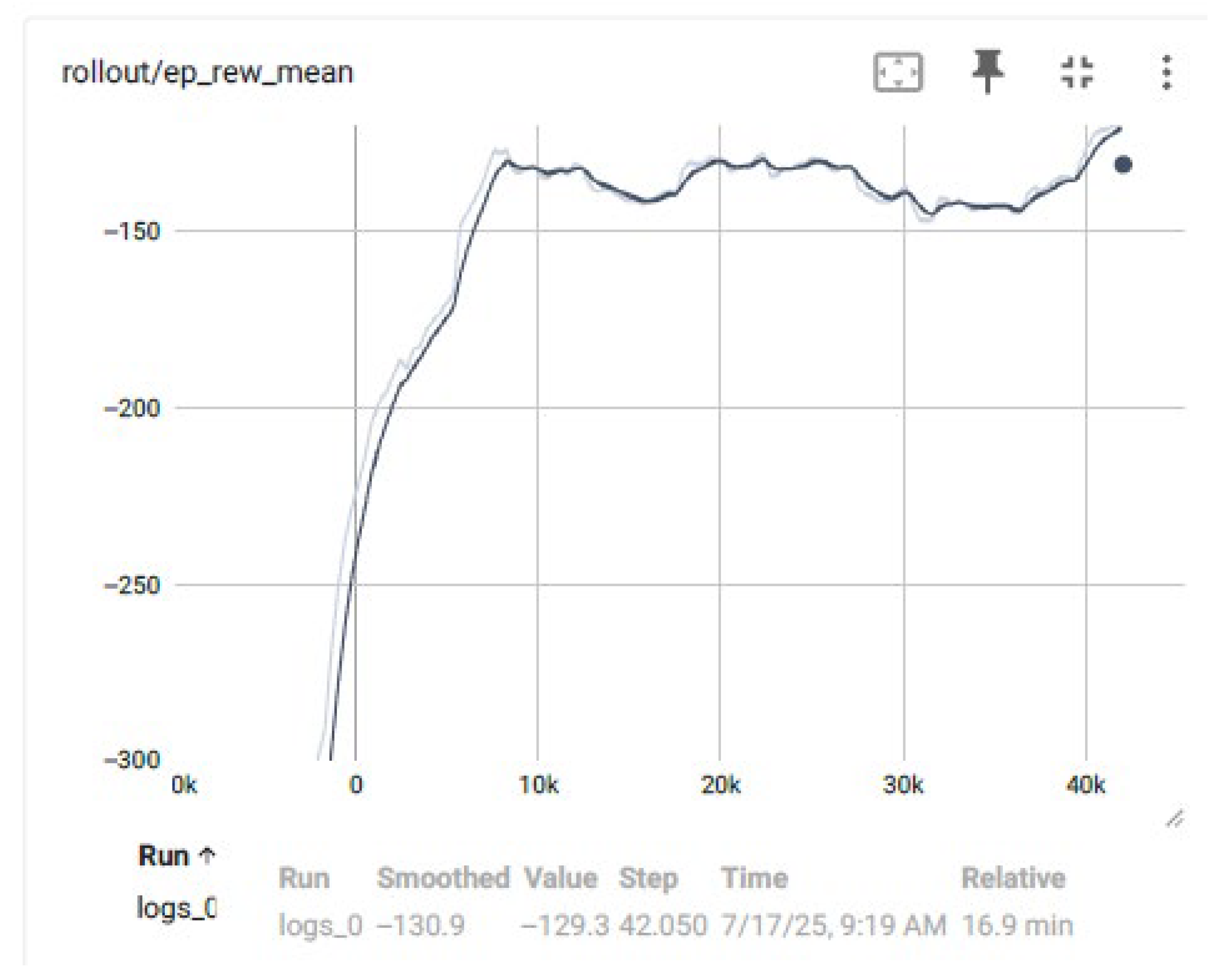 Figure 4. It is observed how the reward improves when the number of steps per episode increases. The y-axis is the reward, and the x-axis is the steps of the loop. At the beginning, the negative value of the reward is high, but it decreases till its approximate stabilization, confirming that the Agent is learning and the model is improving.