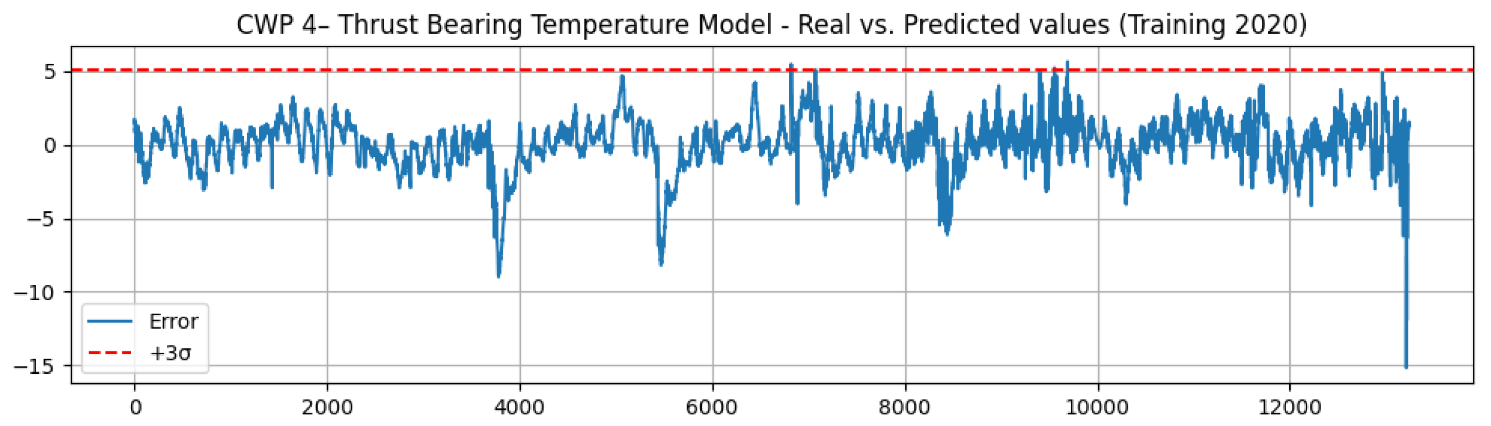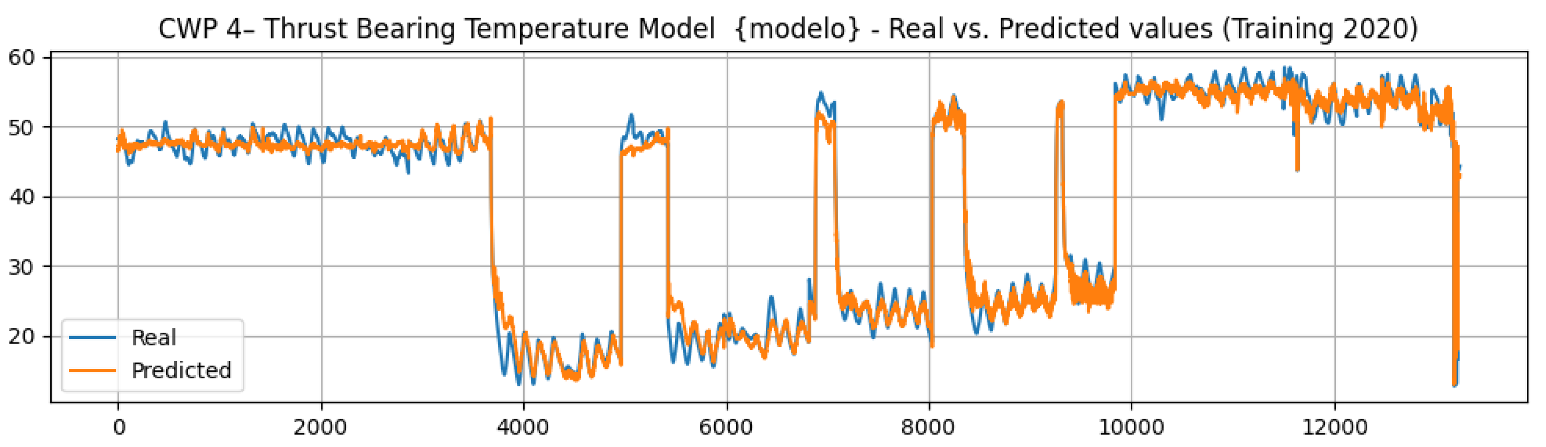 The model was tested with the subsequent years’ data in order to discover some possible anomaly in the thrust bearing temperature of CWP 4, but no abnormal values were found for this case. The prediction time was 20 s.