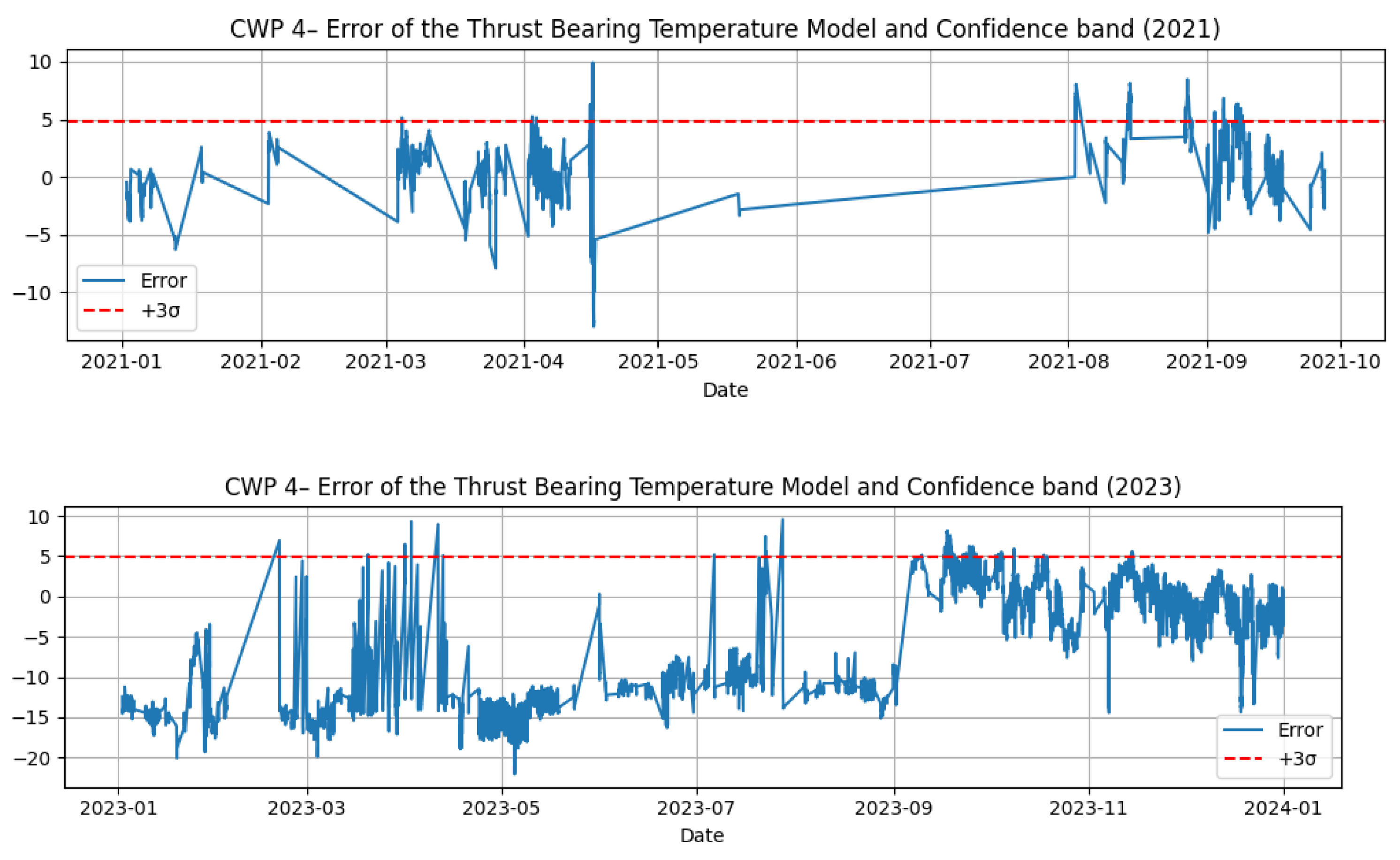 Even when the error is small, it has to be considered to reduce the possible number of false alarms if it is to be used for detecting an abnormal temperature in the pump’s thrust bearing. For this purpose, an upper confidence band for the error is defined covering 3 times the standard deviation observed for the training error, and is shown in