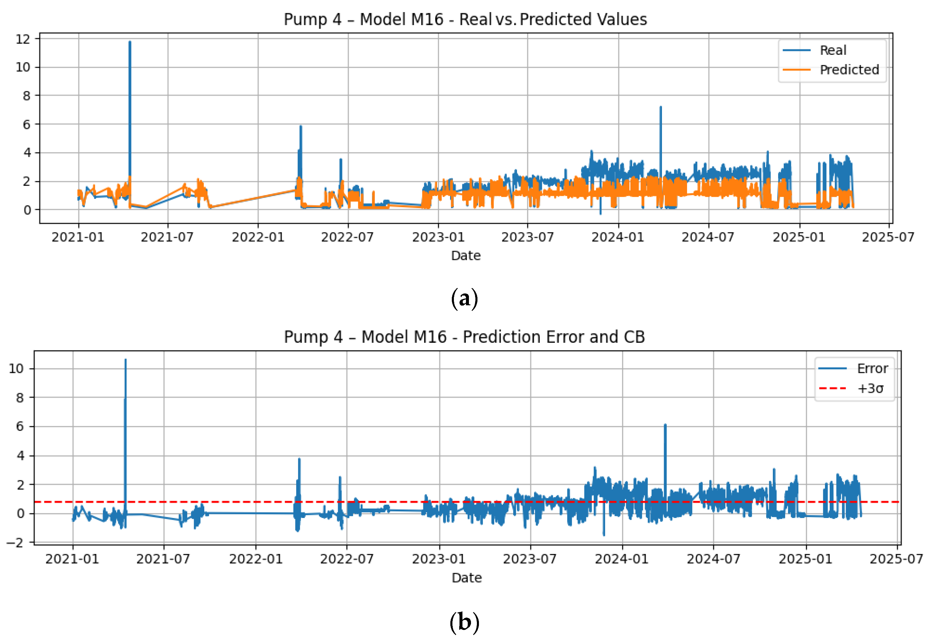 Figure 9a, it is observed that the real and predicted values for the vibration studied were as expected until around the end of 2023, but an increasing deviation is observed from this date. This deviation of the error is better observed in the middle of