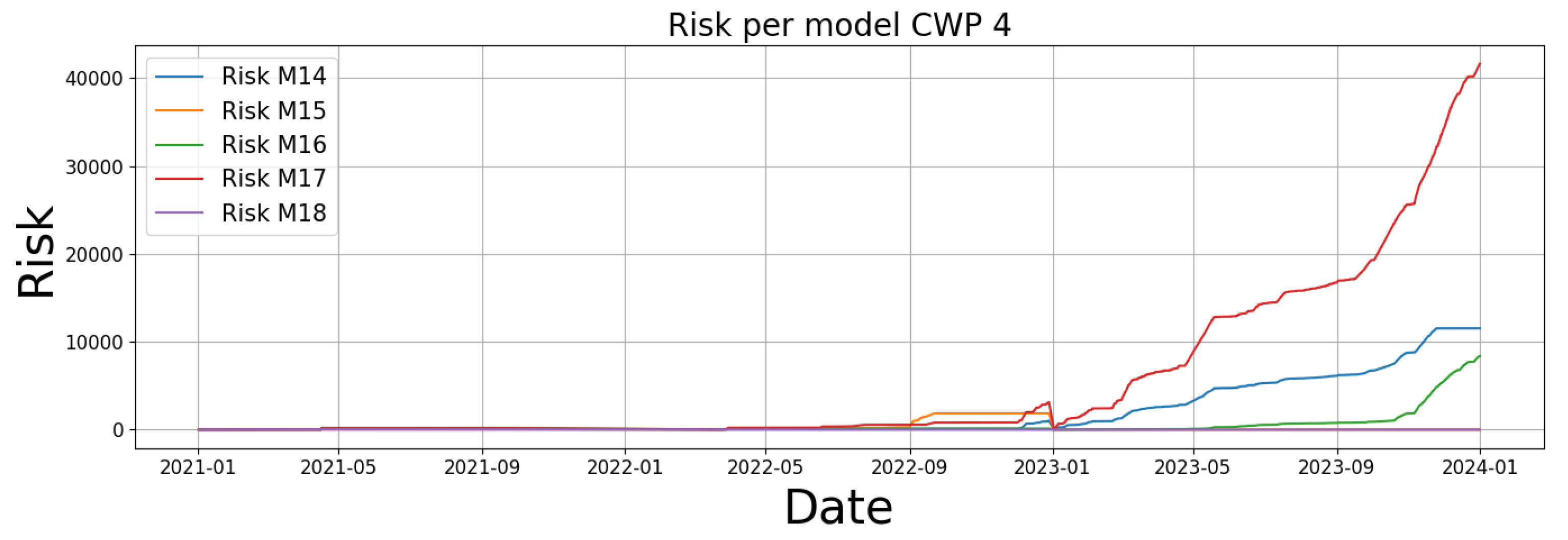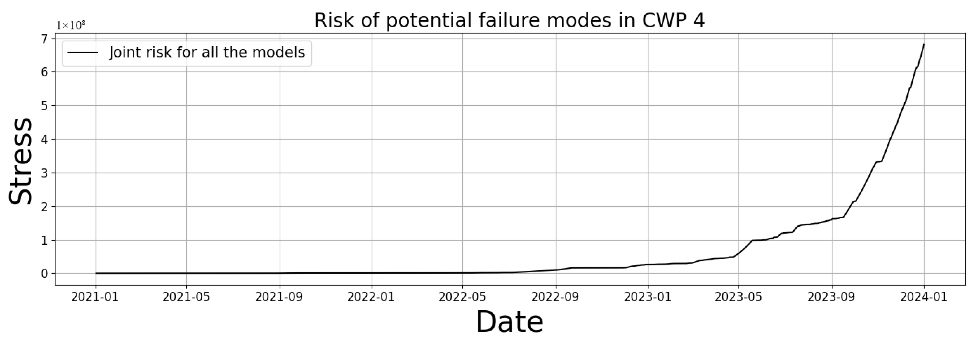 Figure 9c reflects the evolution of this indicator over time. At the beginning of the time period represented, the value 0 indicates that CW4’s health is good due to this failure mode, and that the failure mode risk does not exist. However, this risk increases from the end of 2023 to the last date represented. The most important feature to observe is the slope of the trend because this can signal rapid degradation, which is key information for maintenance and operation crews.