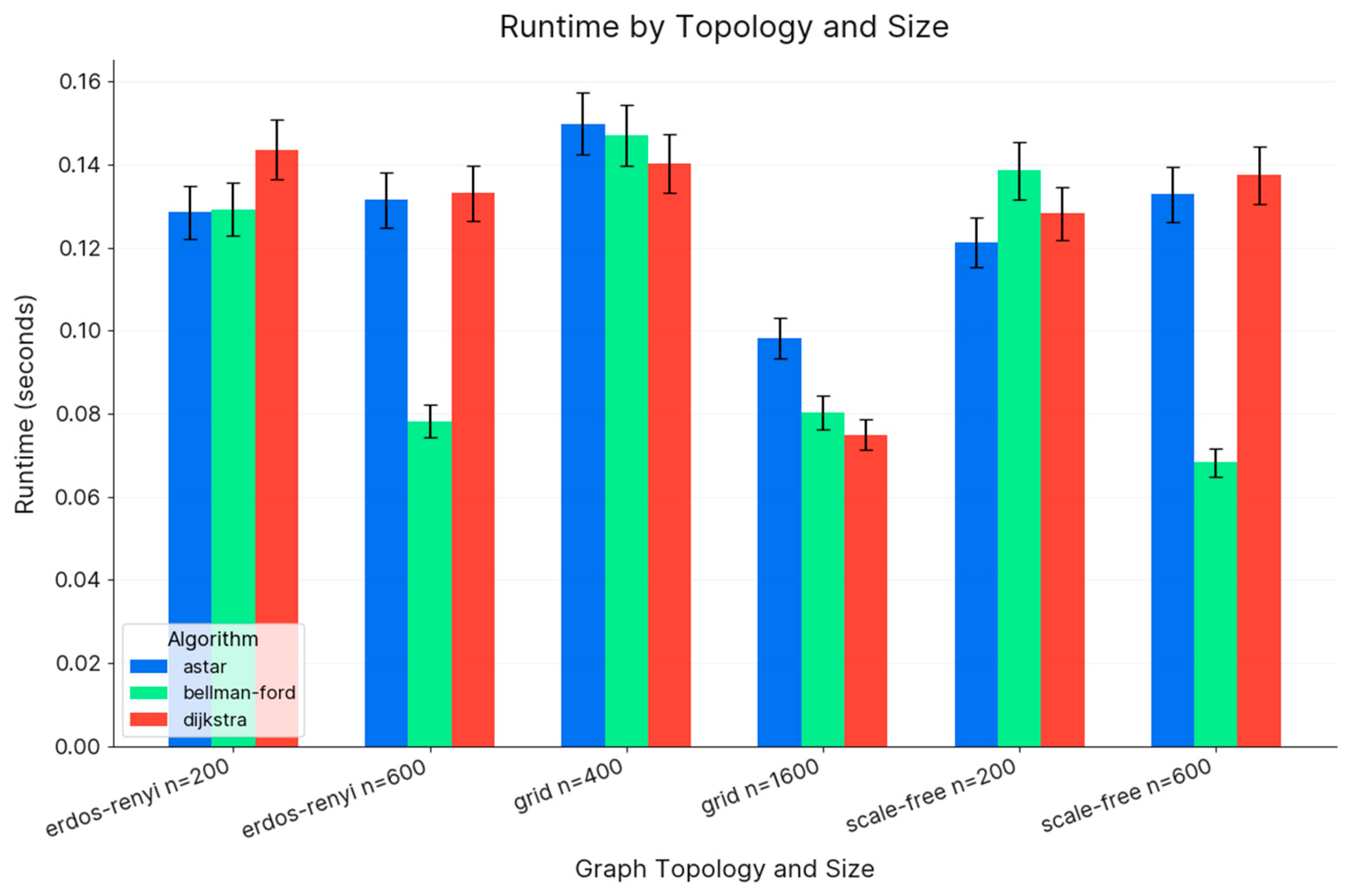 This study aims to conduct a comparative, topology-aware evaluation of Dijkstra’s algorithm, A*, Bellman-Ford, and a neural model with respect to time efficiency and memory consumption. By structuring experiments across grid, random, and scale-free graphs at multiple scales, we align our analysis with representative application archetypes that exhibit varying degree distributions, locality, and clustering characteristics. Such diversity is essential: grids mimic spatial and road-like networks where admissible, consistent heuristics are straightforward; random graphs reveal average-case behavior and sensitivity to edge density; and scale-free graphs test algorithmic robustness against heterogeneity and hub nodes [