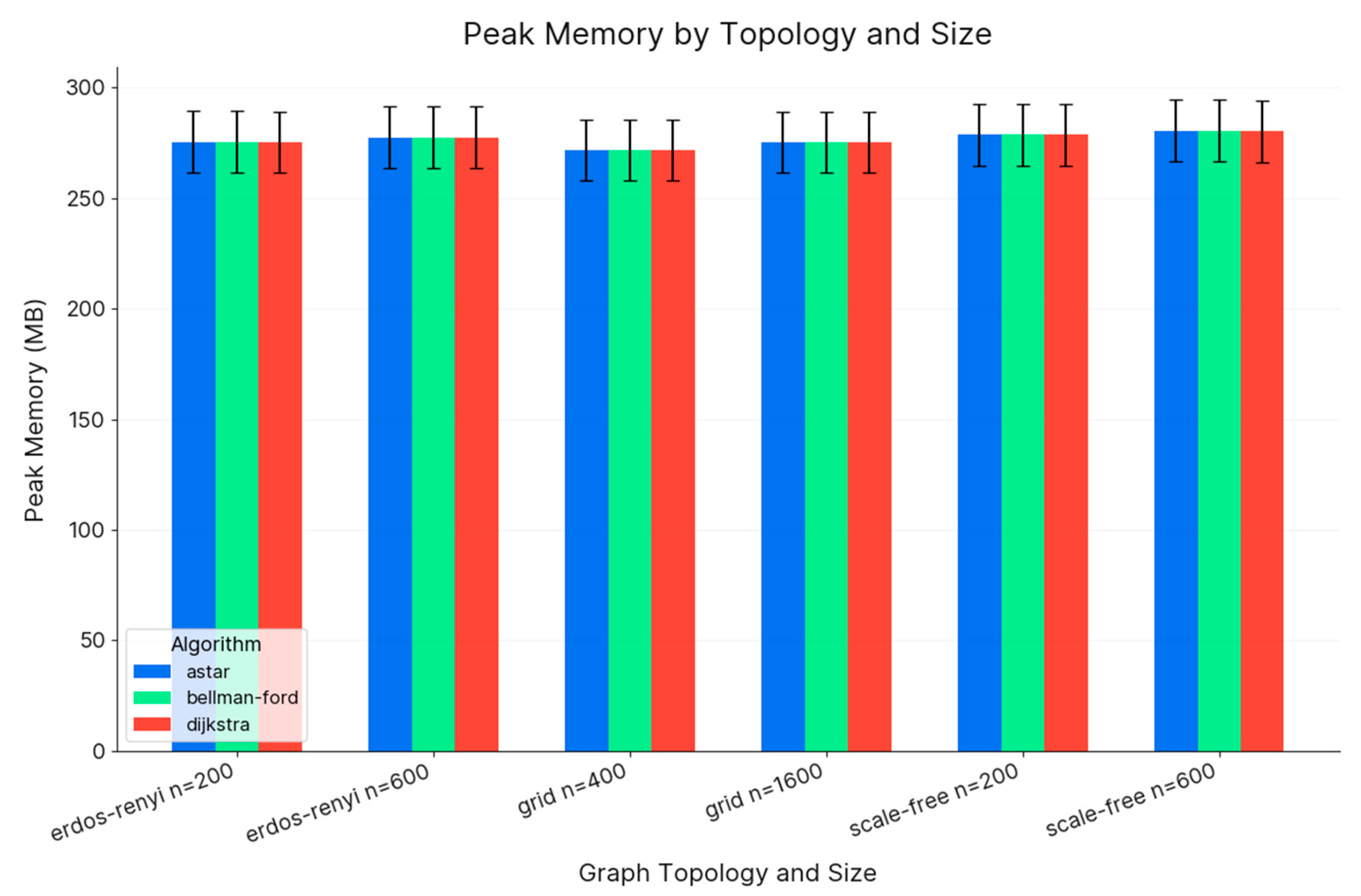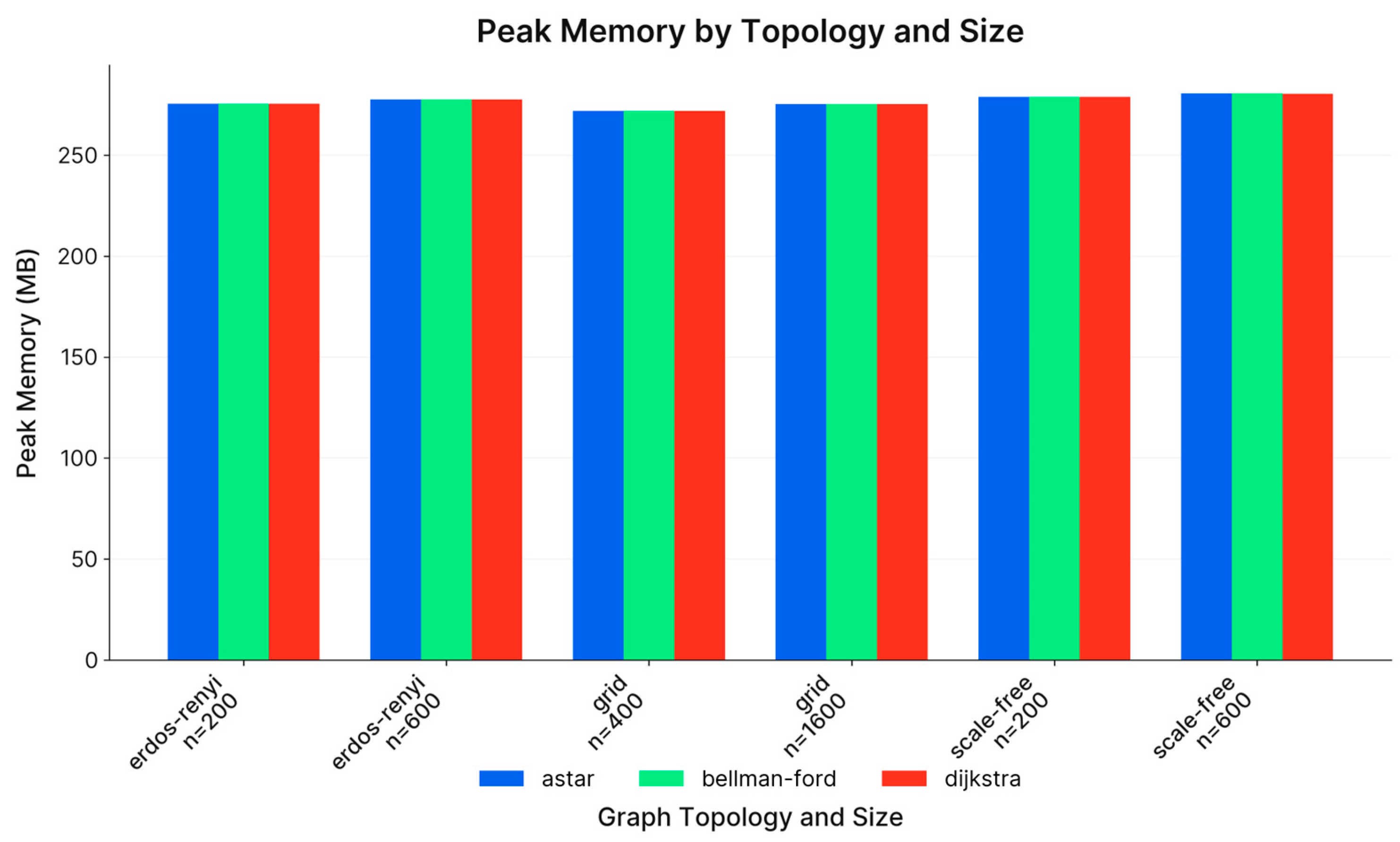 The peak resident memory usage remained closely aligned across the classical algorithms. The primary factors contributing to memory consumption were the overhead associated with Python objects and the data structures used for queues and visited nodes, rather than allocations specific to each algorithm.