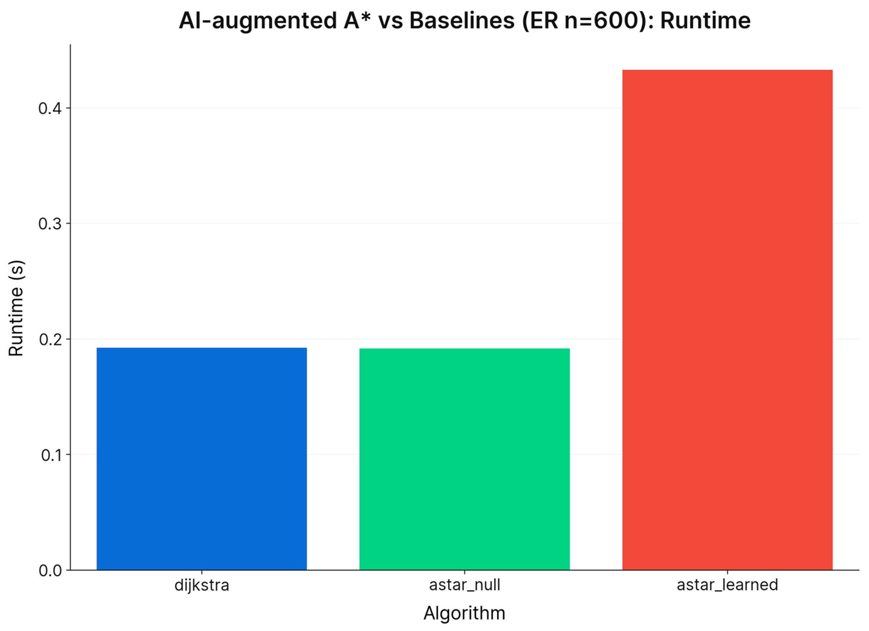 While benchmarking classical algorithms is not in itself a novel contribution, it is essential for isolating the specific value and potential risks introduced by learned components. Without this rigorous baseline, the marginal utility of the AI augmentation cannot be accurately assessed. Therefore, our contribution should be interpreted as a systematic empirical characterization of the interaction between standard machine learning models and established graph search mechanics. We focus on quantifying the operational impact of this integration, rather than proposing a fundamentally new shortest-path algorithm.