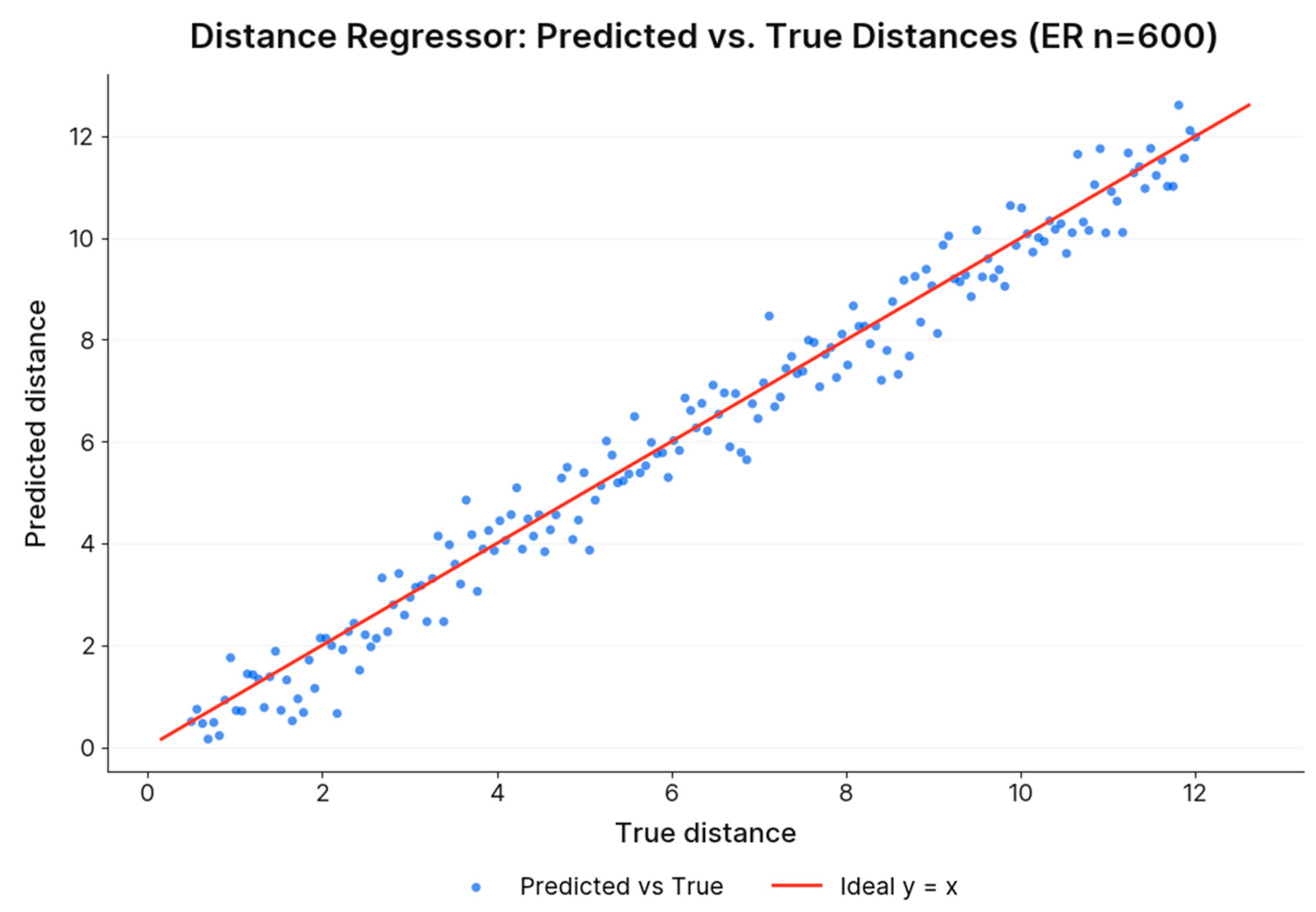 Figure 5). While predicted distances generally track the identity line, they exhibit significant dispersion, particularly at larger path lengths.