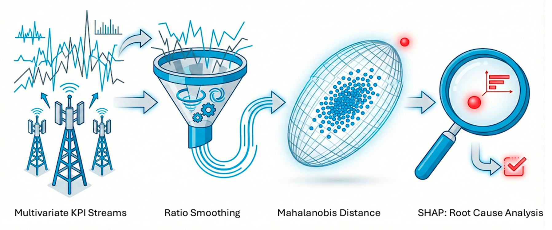 While the proposed MD–based approach effectively captures multivariate deviations, it is particularly suited for detecting multivariate point anomalies, where individual observations deviate jointly across several KPIs. However, the method does not explicitly model temporal patterns, which means it may miss certain contextual or collective anomalies. For example, values that appear normal during nighttime but become abnormal during peak traffic hours, or gradual performance drifts that remain within statistical thresholds at each time step but accumulate over time. In practice, however, such contextual or collective anomalies are less frequent in telecom networks, where point anomalies are the predominant type of issues. It is also important to note that the superior performance of the raw KPI input observed in this study reflects the specific datasets used in our experiments and may not generalize to all network scenarios. In future work, hybrid methods that integrate multivariate anomaly detection with temporal modeling techniques (e.g., rolling baselines, time-aware thresholds, or temporal embeddings) could be explored to address these limitations more effectively.