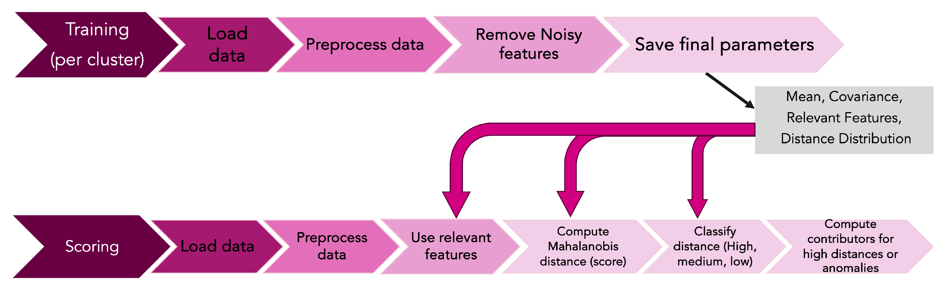In the prediction phase, which operates in real time, the model processes batches of element IDs corresponding to each incoming datetime key. For each element ID, the model calculates an anomaly score using the MD, assigns a score classification (low, medium, or high risk), and identifies the top contributing factors for instances classified as high-risk anomalies.