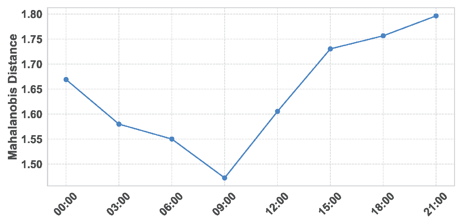 We hypothesize that this result is due to MD’s reliance on covariance structure rather than absolute feature values. The multivariate relationships between KPIs remain relatively stable across different time periods, even as the absolute values of traffic volumes and individual KPI magnitudes vary. This structural stability allows the covariance-based approach to maintain consistent detection performance across seasonal datasets.
