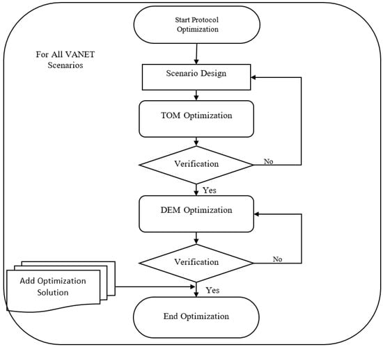 The study proposed two optimization techniques: Taguchi and Differential Evolution methods. The Taguchi method has been benchmarked in various studies for parameter tuning and optimization in communication networks. For example, in [,], Taguchi was used to optimize routing protocols for wireless sensor networks (WSNs), showing that it can significantly improve network performance with fewer experiments compared to traditional optimization methods []. This aligns with the efficiency needs of VANETs, where rapid adaptation to changing conditions is required []. On the other hand, Differential Evolution (DE) has been extensively benchmarked in evolutionary algorithms and applied in optimization problems, particularly where the search space is large and non-linear. In [], DE was applied to traffic management and network routing in VANETs, where it outperformed other methods like genetic algorithms in terms of convergence speed and solution accuracy. This makes DE an ideal choice for optimizing VANET protocols, as it can effectively handle complex, multi-dimensional search spaces, such as those involving packet delivery ratio, delay, and throughput. Both TOM and DEM were chosen not only for their demonstrated success in similar optimization tasks but also for their ability to provide adaptable solutions under varying conditions, such as city and highway scenarios in VANETs. By benchmarking these methods against alternative techniques, we ensure that our results are both robust and representative of the best possible optimization strategies available in the literature.