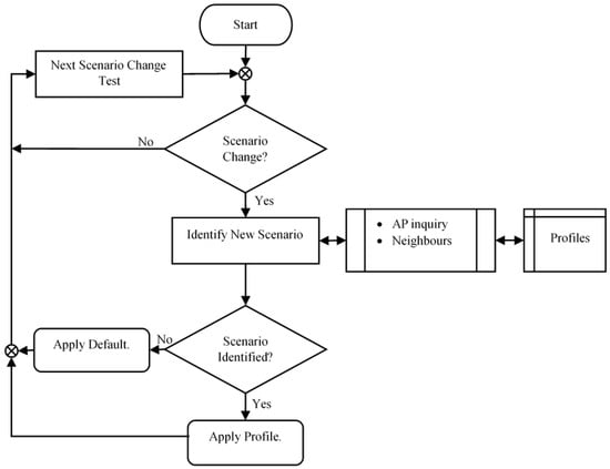 The throughput was optimized via two optimization methods: the Taguchi Optimization Method (TOM) and the Differential Evolution Method (DEM), as shown in the flowchart of Figure 2. The process started with optimizing the routing protocols parameters for a specified scenario and performance metric. This process is achieved with two optimization methods, a single-objective optimization (TOM) followed by a multi-objective optimization (DEM) process, to find the optimum solution of the fine-tuned parameters values, as shown in our previous publication []. The goal of the TOM is to identify the best fine-tuned values for a set of routing parameters in each routing protocol that optimizes one of the network performance metrics (throughput). Further, the optimum solution obtained by TOM is used as initial conditions for the DEM to find a single solution for all network performance metrics. The optimization process results in a set of parameters that are fine-tuned values of a routing protocol in each VANET scenario. Further, the optimization results are used to design and implement CM-AODV and CM-GPSR routing protocols. Chameleon Method Routing (CM-routing) mechanism is inspired by biological nature of the chameleon lizard. Chameleon lizards tend to change their skin color to the surrounding environment to either hide themselves from being hunted, or for hunting. Similarly, CM-routing aims at fine-tuning the routing parameters of routing protocols, which results in the highest network performances for a running network situation. This stage emphasizes the design of the CM method and its integration with two routing protocols (AODV and GPSR). The Chameleon method is aimed at obtaining the best performance of a routing protocol when a network device moves from one network scenario to another. Figure 3 shows the flowchart of the CM. CM assumes that a best solution is given for each VANET scenario, which is obtained by the optimization mechanism. Further, the obtained optimum solutions are integrated with the routing protocol as profiles mapped to the desired VANET scenario, then a routing protocol selects the best profile for the current running situation.