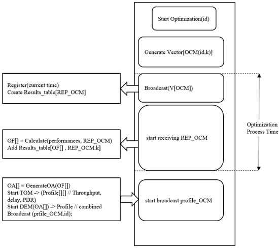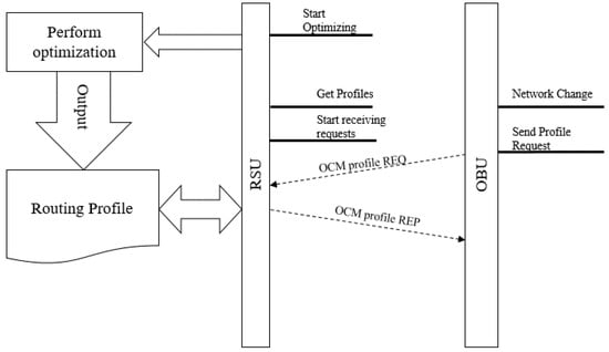 The RSU is responsible for initiating the operation, receiving and processing responses from the OBU, and calculating and obtaining the optimized configuration and distributing the obtained configuration to OBUs. The time process following these operations is presented in Figure 8. The initialization of the optimization process should take place for a noticeable change in the network scenario. RSUs are static (immobile) nodes in VANETs; this implies their attachment to the same network scenario all the time. VANET network conditions may change in terms of scalability (number of OBUs) for different times during a day “the road traffic condition changes during high traffic hours”; for that, a day time-based approach is preferable to start the optimization process in RSUs and should be controlled by the network administration or preconfigured on the RSU.