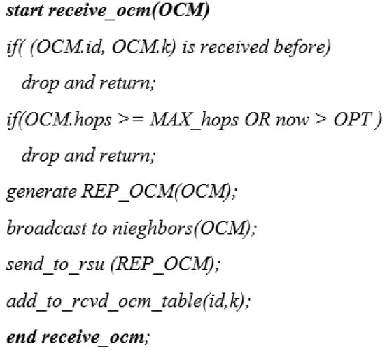 The OBU receives two types of requests from the RSU: OCM and profile. OCM type is received during the optimization operation, and profile type is received at the end of the operation. When an OBU receives an OCM, it starts by evaluating the carried configuration to process the message accordingly, and then creates a REP_OCM message. REP_OCM contains two pieces of information, the OBU id and the possibility to receive the parent OCM RES. OBU id is the IP address of the OBU, and the second parameter is a decision made based on the information contained in the parent OCM. For the OBU to make this decision, it starts by evaluating the configurations in the OCM. These configurations, such as Beacon interval in the GPSR protocol and Hello Interval in the AODV, are different for each routing protocol, and the evaluation process is achieved by comparing their values in the OCM message and the current configuration in the protocol. The evaluation comes with a decision of whether this message receivable or not. Once the REP_OCM is generated, the OBU will start to send it to the RSU and re-broadcast the original OCM to its neighbors. The implementation pseudocode of this process is presented in Figure 6.
