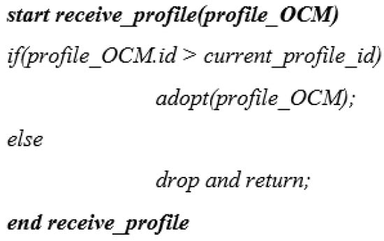 The second type of message received by the OBU is a profile OCM. The profile OCM contains the optimized configuration, as calculated in the RSU. For the OBU to adopt the received profile, it first checks if the OCM id is fresh or not, this is achieved by comparing the current profile id and the RSU id with the received one. For example, if the received OCM id is greater than the current adopted profile and the RSU id is registered as the closest RSU, the received profile will take over the current one. Otherwise, the message will be ignored. The pseudocode of this process is show in Figure 7.