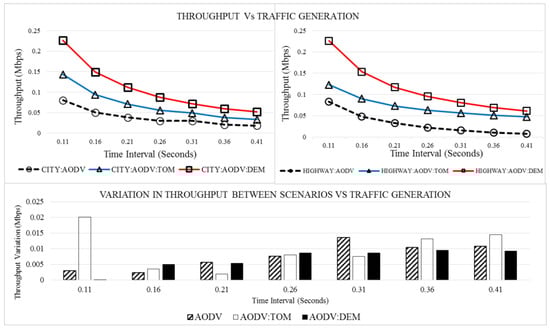 Throughput and variation comparison between AODV, AODV:TOM, and AODV:DEM in city and highway scenarios.