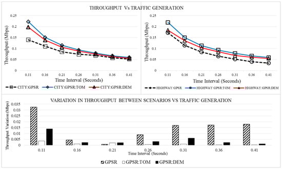 Throughput and variation comparison between GPSR, GPSR:TOM, and GPSR:DEM in city and highway scenarios.