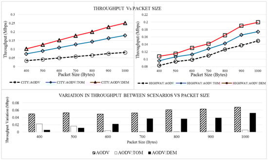 Throughput and variation comparison between AODV, AODV:TOM, and AODV:DEM in city and highway scenarios for different packet sizes.