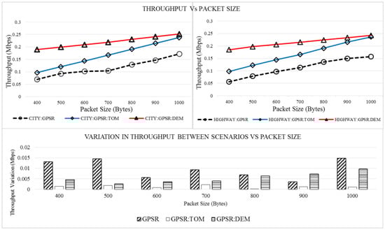 Throughput and variation comparison between GPSR, GPSR:TOM, and GPSR:DEM in city and highway scenarios for different packet sizes.
