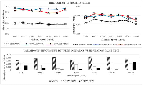 Throughput and variation comparison between AODV, AODV:TOM, and AODV:DEM in city and highway scenarios for different mobility speeds.