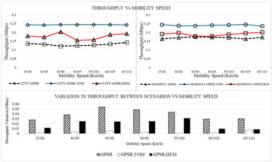 Throughput and variation comparison between GPSR, GPSR:TOM, and GPSR:DEM in city and highway scenarios for different mobility speeds.