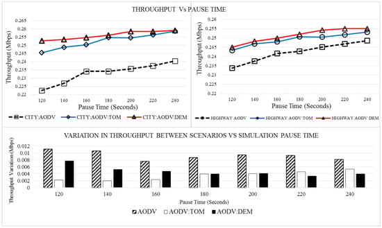 Throughput and variation comparison between AODV, AODV:TOM, and AODV:DEM in city and highway scenarios for different pause times.