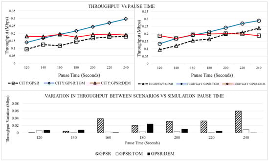 Figure 15 and Figure 16 show the observed throughputs of AODV, AODV:TOM, AODV:DEM, GPSR, GPSR:TOM, and GPSR:DEM against different pause times in city and highway scenarios. The observed throughputs of all protocols vary according to pause time except for GPSR:DEM, which shows a linear observation for all pause times. AODV:TOM, GPSR:TOM, and AODV:DEM managed to improve the throughput for all pause times; however, GPSR:DEM obtained results better than GPSR for earlier pause times and less for pause times above 200 s. AODV:TOM, in its variation between city and highway, increases proportionally with pause time, while AODV:DEM showed variation decreases proportional to pause time. Both GPSR:TOM and GPSR:DEM exhibit small variations in throughput, similar to findings in [] with Fisheye State Routing (FSR) and Dynamic Source Routing (DSR). GPSR:TOM improves congestion handling but may introduce routing inefficiencies in sparse networks, while GPSR:DEM optimizes energy and density management at the cost of increased overhead. FSR reduces routing overhead but suffers from outdated information in dynamic networks, whereas DSR, despite its adaptability, incurs high overhead and latency in large-scale deployments. These limitations highlight the trade-offs in protocol selection based on network mobility, scalability, and real-time performance requirements.