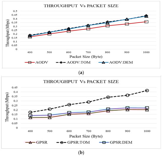Figure 17 presents a comparative evaluation of the throughput performances of different routing protocols, including AODV, GPSR, CM-AODV, and CM-GPSR, under varying packet sizes. The analysis focuses on two categories: (a) AODV, GPSR, and CM-AODV and (b) CM-GPSR. Throughput, defined as the rate of successfully transmitted data packets over a network channel (measured in Mbps), is examined concerning different packet sizes. The observed results indicate that throughput is directly proportional to the packet size, as larger packets reduce protocol overhead and improve transmission efficiency. At a packet size of 1000 bytes, AODV:TOM and AODV:DEM throughput increased by 29% (0.35 to 0.45 Mbps), GPSR:TOM improved by 100% (0.20 to 0.40 Mbps), while GPSR:DEM showed a marginal increase of 0.05 Mbps. The smaller improvement in GPSR:DEM suggests that the optimization mechanism in CM-GPSR might not be as effective in all scenarios, likely due to GPSR’s reliance on geographical routing, where link stability is affected by node density and mobility. These results highlight the impact of optimization on routing efficiency, with CM-AODV and CM-GPSR demonstrating better route selection, mobility handling, and adaptive parameter tuning that enhance throughput. The findings further emphasize that throughput is influenced by routing parameters such as mobility models, transmission power, and congestion control mechanisms. AODV, as a reactive protocol, benefits from reduced control overhead, whereas GPSR, a geographical routing protocol, performs better in dense networks but may suffer in highly mobile environments. The optimized versions, CM-AODV and CM-GPSR, enhance routing efficiency through congestion-aware mechanisms, dynamic metric adjustments, and improved path selection strategies. Ultimately, the results confirm that routing optimization significantly enhances network performance, with higher data rates, reduced latency, and better adaptability to changing network conditions, particularly in mobile ad hoc and sensor networks. On the other hand, the throughputs of AODV, GPSR, ADOV:TOM, and GPSR:TOM improved for different vehicle speeds. AODV:DEM and AODV:TOM achieved an improvement over AODV by 21% (0.37 to 0.45 Mbps). GPSR:TOM improves the throughput by 100% (0.2 to 0.4 Mbps), while GPSR:DEM showed an improvement of 0.07 Mbps. All routing protocols maintained variation in an average range of 0.02 Mbps for all vehicle speeds except GPSR:DEM and GPSR, as their observed throughput is proportional to vehicle speed. The findings, as summarized in Table S1 of the Supplementary Materials, demonstrate that routing parameter preferences vary significantly between city and highway environments during the experimental study, particularly in terms of MaxJitter and beacon interval settings, directly influencing delay and packet delivery performance. These insights highlight the necessity for adaptive routing protocol designs in VANETs. To enhance applicability, CM-AODV and CM-GPSR have been developed using the Chameleon method with TOM and DEM optimizations, ensuring improved routing efficiency and adaptability. While this study primarily relies on simulations, the extensive experimental framework provides a strong basis for real-world applicability, and future research will focus on incorporating actual vehicle data and field test scenarios to further validate the findings.