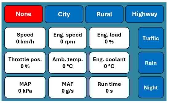 We aimed to use artificial intelligence (AI), especially ANNs, to solve the classification problem. These methods learn through supervised learning, so labeled data are needed, where the label indicates where the driving actually occurred. GPS was unsuitable for this purpose because of privacy rights and poor performance in cities and rural areas. Therefore, a graphical user interface has been created on a touch screen in addition to the data logger, allowing the driver to select the road type manually (Figure 1).