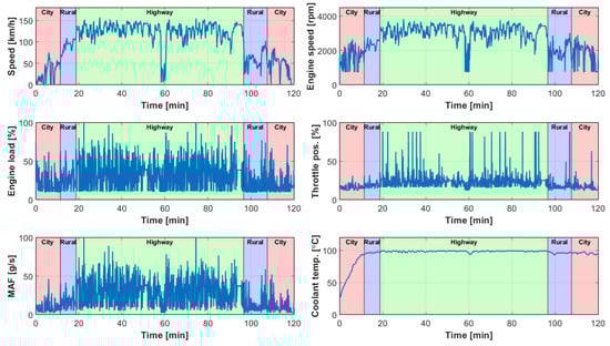 Figure 2 shows the typical pattern of a countryside trip in Hungary. Red, blue, and green backgrounds represent city, rural, and highway sections, respectively. In the speed profile, it can be seen that around minute 60, the speed on the highway drops below 50 km/h, which makes classification difficult. Furthermore, speeds are lower in rural areas after the highway than in the last city section. MAP is not included in the figures because a vehicle usually has either MAP or MAF only, and ambient temperature is not included because it does not contain relevant information in this phase.