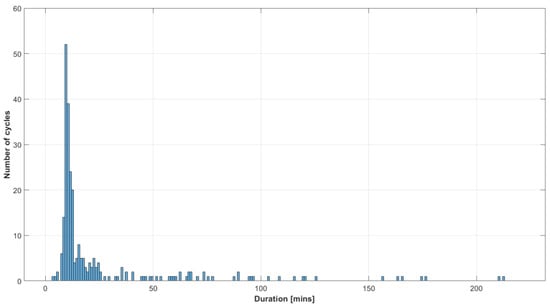 The driving cycles have been split into independent fixed-length subcycles to handle different cycle lengths. To determine this length, we examined the distribution of cycle durations shown in Figure 3. It can be seen that most of the drives (52) were between 9 and 10 min in duration, and the minimum duration was 3 min. Choosing too high length will lead to shorter cycles being omitted from the training, resulting in data loss. Too short durations can lead to misclassification in the case of slower driving. As an intermediate option, a 180 s splitting time was chosen.