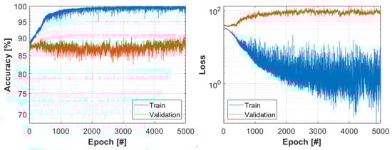 The evaluation metrics are used to identify the effectiveness and performance of a model. In the case of classification problems, this is typically the accuracy, which is defined as the ratio of the correct predictions divided by the total number of predictions. Loss functions are used to determine the error between the prediction and the target value, and the goal of the training is to minimize this error. The preferred loss function is the categorical cross-entropy, as this, combined with the softmax function, assigns a probability to each class, which can be used for further analysis. There is no significant difference between the optimization algorithms, so adam was chosen as one of the most efficient methods. The most frequently used values from the literature and practice were selected for batch size and train–validation ratio, 5 and 80–20%, respectively. The learning duration, i.e., the epoch number, was determined based on Figure 4. The runs were performed with the following model settings:
