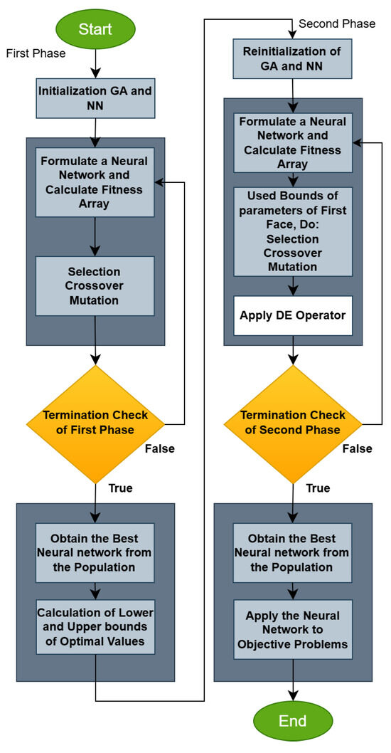 This paper proposes a two-stage technique for the efficient training of artificial neural networks. In the first stage, a genetic algorithm is used to efficiently identify a range of values within which the parameters of the artificial neural network should be optimized. In the second stage, a genetic algorithm is used to optimize these parameters, and it uses a new operator to enhance the results. This new operator is based on the differential evolution technique [42], and it is applied periodically to randomly selected chromosomes of the genetic population. The first stage of the technique is necessary to ensure that the parameters of the artificial neural network are trained within a range of values, which will prevent their overfitting as much as possible. In the second stage, the differential evolution method is selected as the base of the new operator. This method is an evolutionary technique widely used in a series of practical problems, such as community detection [43], structure prediction [44], motor fault diagnosis [45], and clustering techniques [46]. Furthermore, this method is chosen as the basis for the new genetic operator due to the small number of required parameters that must be specified by the user.