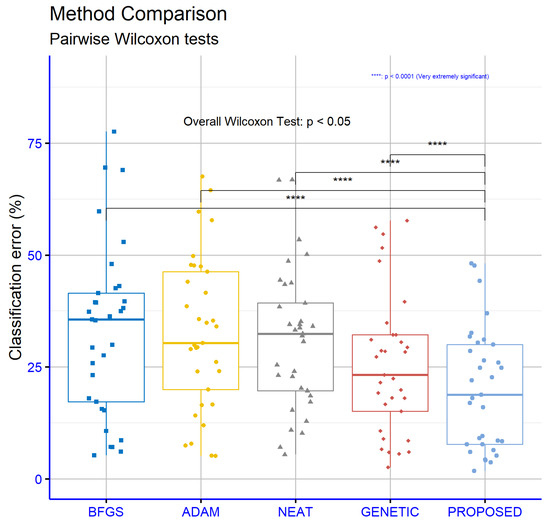 Additionally, determining the optimal architecture of an artificial neural network can effectively contribute to its training: on the one hand, it will reduce the required training time, and, on the other hand, it will eliminate the problem of overfitting. To tackle this problem, a number of researchers have proposed many methods, such as genetic algorithms [36,37], the application of the PSO method [38], and the application of reinforcement learning [39]. Also, Tsoulos et al. proposed the use of the grammatical evolution technique [40] to construct artificial neural networks [41].