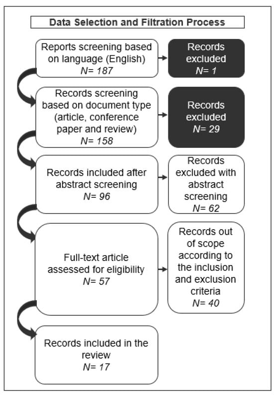After an abstract screening was carried out, records were excluded. The remaining 57 articles underwent full-text eligibility assessment, where 40 records were further excluded for falling outside the scope defined by the inclusion and exclusion criteria (Table 2). After this thorough evaluation, 17 articles were selected for the final inclusion stage of the PRISMA process flow (Figure 3). To support the process described above, the author used the open-source reference management software—Zotero—to manage bibliographic data. All citations were imported into Zotero.