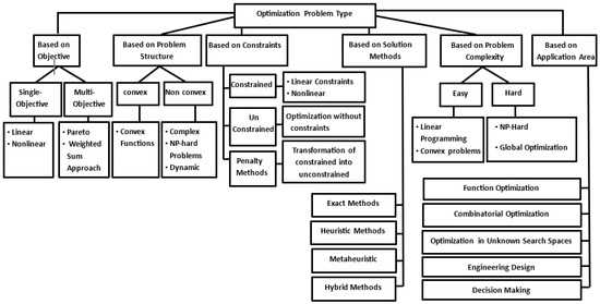 Understanding different optimization problem types helps in choosing the appropriate mathematical models and solution approaches. Each type has its challenges and requires a special technique for a solution. In general, optimization problems can be divided into six main categories based on their objectives, structural properties, constraints, solution methods, computational complexity, and application domains. As a matter of fact, the optimization problems usually involve a combination of these six types.