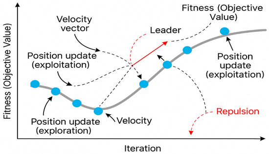 The framework incorporates velocity-based updates, which apply momentum-based searches instead of random moving through the solution space. The algorithm uses historical positional data to enhance agent steering behavior as an adaptive system within the solution space. This facilitates a balanced search behavior, enabling global exploration in early iterations and focused exploitation in later stages, thereby improving solution quality and search efficiency.
